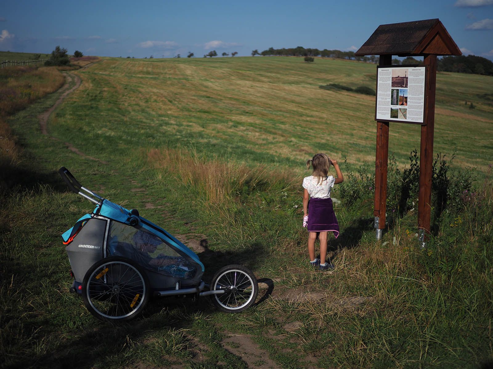 Z Adolfova jdeme ještě kousek po silnici. Dáška stále spí a Tomík je v klidu. Užívám si to ticho a kochám se pohledem na barevné louky. V Habarticích odbočujeme na lesní cestu a z dálky už vidíme hotel na Komáří hůrce.