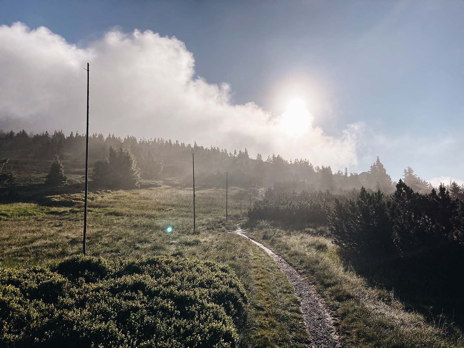 Budím se v 6 ráno. Svou roli “první vzhůru” jsem už dávno přijala, a tak vycházím ven na sluníčko. Ano, sluníčko(!), tak ostré, že málem oslepnu. Protahuji se a procházím se po nádherné horské louce v okolí Jelení studánky.