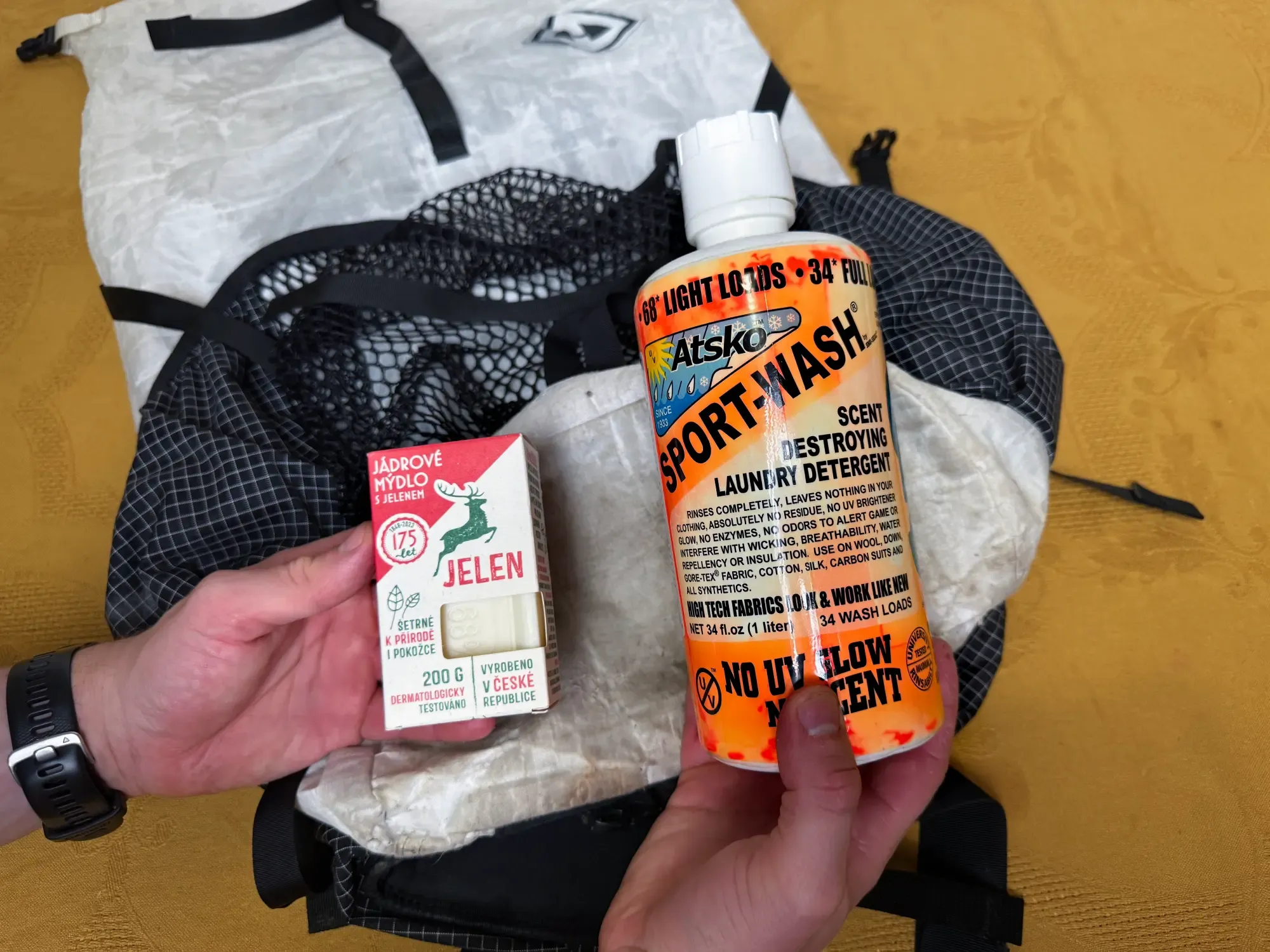 Na mytí používej pouze jemné mýdlo bez parfemace nebo speciální čisticí prostředky určené na konkrétní tkaninu, ze které je batoh vyroben. Naším největším favoritem na čištění batohů je tradiční mýdlo Jelen, Atsko Sport Wash (v balení po 500 ml a 1000 ml) a Nikwax Tent & Gear SolarWash.