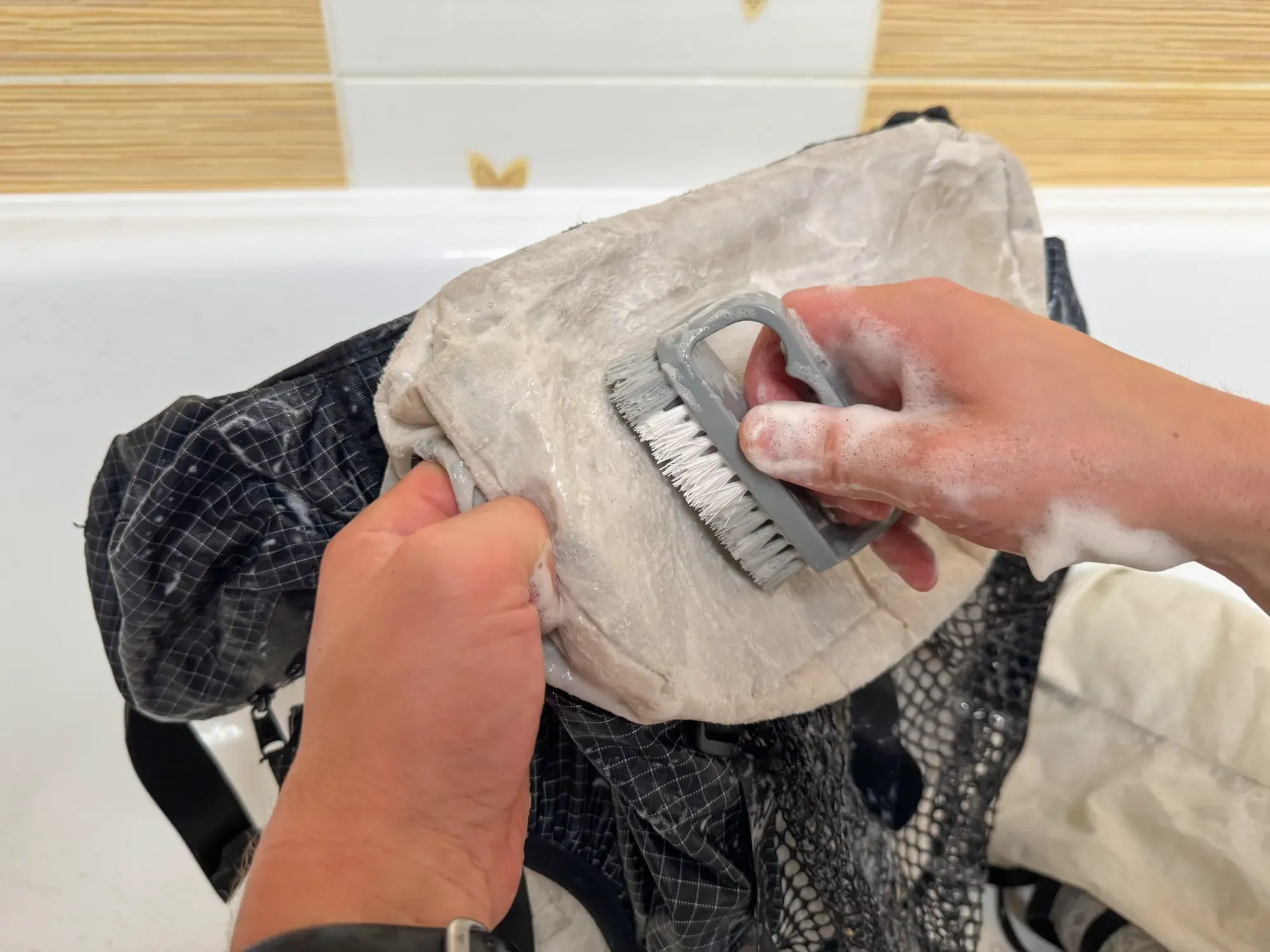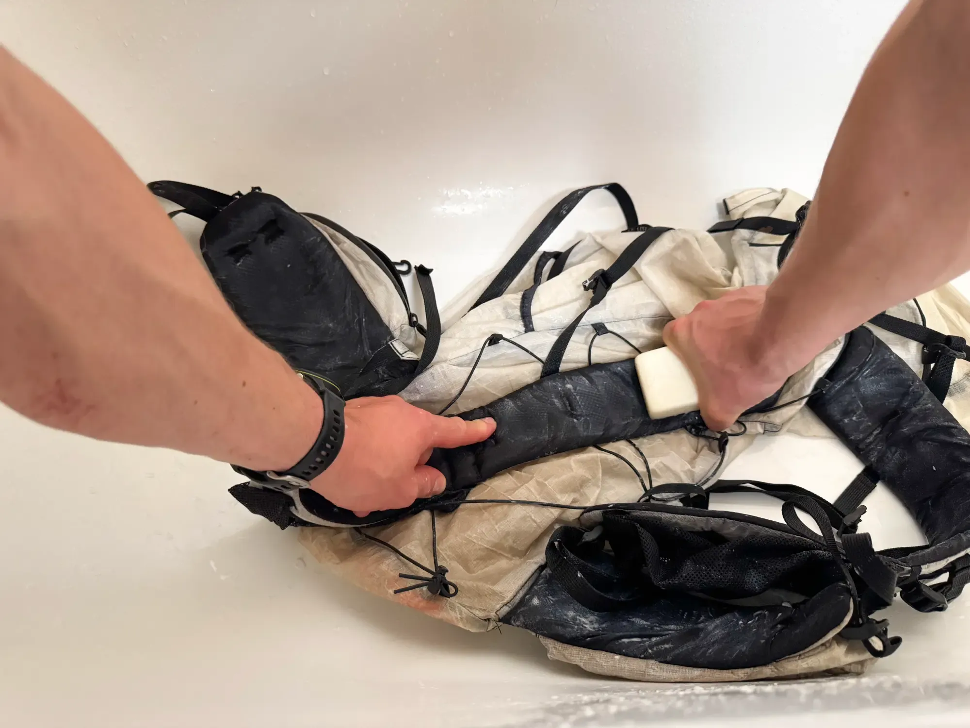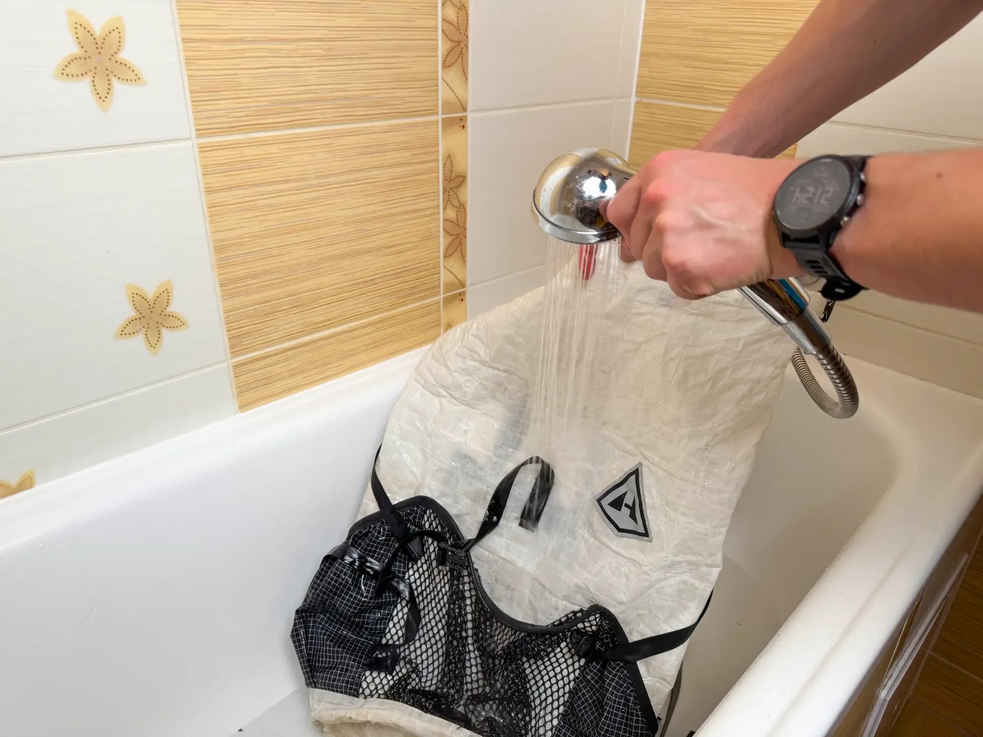 - Namáčení a mytí 🫧🧽 – Ponoř batoh do vody a jemně promáčkni všechny části. Houbičkou nebo měkkým hadříkem důkladně očisti vnější i vnitřní strany. Zaměř se hlavně na místa, která přicházejí do styku s potem – ramenní popruhy, zádový panel a bederní pás. Batoh můžeš obrátit i naruby, aby ses dostal k vnitřní podšívce.