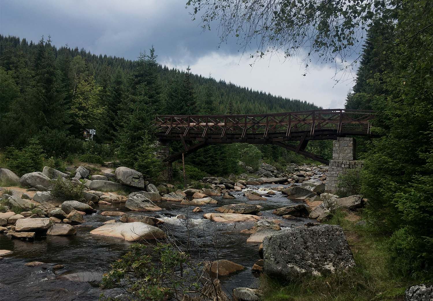Jizerky jsou díky svým hřebenovým „silnicím“ vyhlášené jako hory cyklistů a běžkařů. Ráno načínám přejezd Jizerek nádherným a nekonečným sjezdem po Viničné cestě a pak stejně tak nekonečným tlačením zpět na hřeben. V každém vyhlášeném bufetu dám alespoň kofolu a koláč, a na glykemické vlně se tak snadno vezu až k osadě Jizerka, kde plánuji pokračovat přes hraniční most do Polska. Jenže chyba lávky. Doslova. Most přes Jizeru se stihl od zimy propadnout, a tak mi nezbývá než i s kolem přebrodit. Moje radost z letošní celkem příznivé hydrologické situace opadá, když s kolem nad hlavou v půlce řeky zjišťuji, že tam, kde bývalo vody nad kotníky, je teď po kolena.