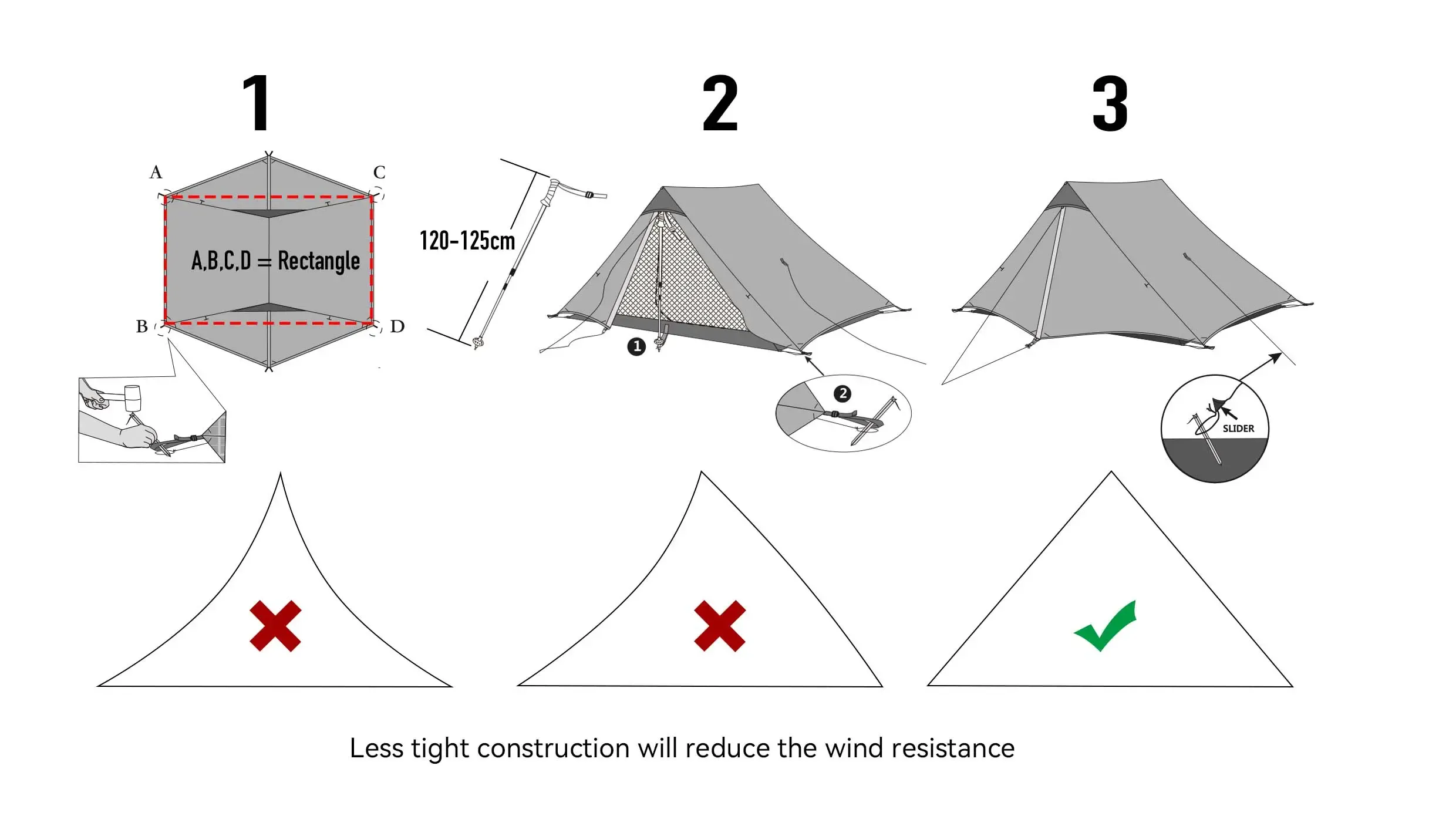 Konstrukce stanu není samonosná, protože se staví na dvě trekové hole o výšce 120–125 cm. Vrcholy je také možné zavěsit na pevnou větev nebo jinou konstrukci. Tvar stanu dobře odolává větru, zatímco osm kotevních bodů a 2 vypínací body zvyšují stabilitu a umožňují správné vypnutí tropika.