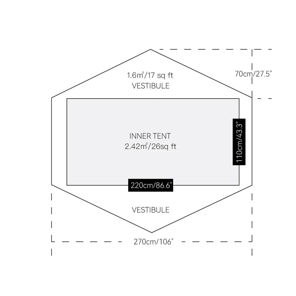 Stan je dostatečně prostorný pro 2 osoby a to i vyšší postavy (vnitřní rozměr 220 x 110 cm, výška 125 cm). Pokud chceš ušetřit gramy a budeš stan využívat sám, podívej se na stan Lanshan pro 1 osobu.