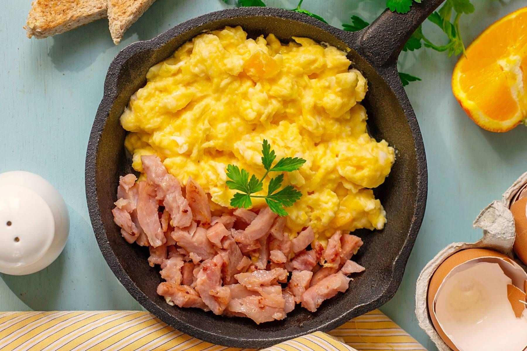Není nad pořádnou snídani! Vychutnej si poctivá míchaná vajíčka smažená na červené cibulce se šunkou a zjemněná smetanou a posypané sýrem Gouda.