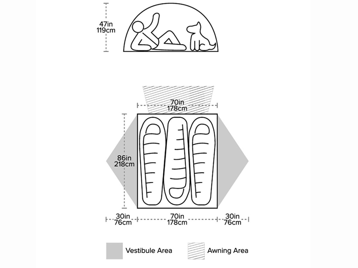 Plně vybavený stan se dvěma bočními vchody s předsíňkami a jedním čelním vchodem, ze kterého si můžeš postavit markýzu. Markýza vytváří extra ventilaci za horkých letních nocí, další únikovou cestu nebo další zastřešený prostor pro chlupaté parťáky nebo vybavení, které nechceš mít přímo ve stanu. Tvar stěn stanu vytváří maximální možný prostor v interiéru. Díky těmto vychytávkám patří Salt Creek SL3 mezi nejuniverzálnější turistické stany od Big Agnes.
