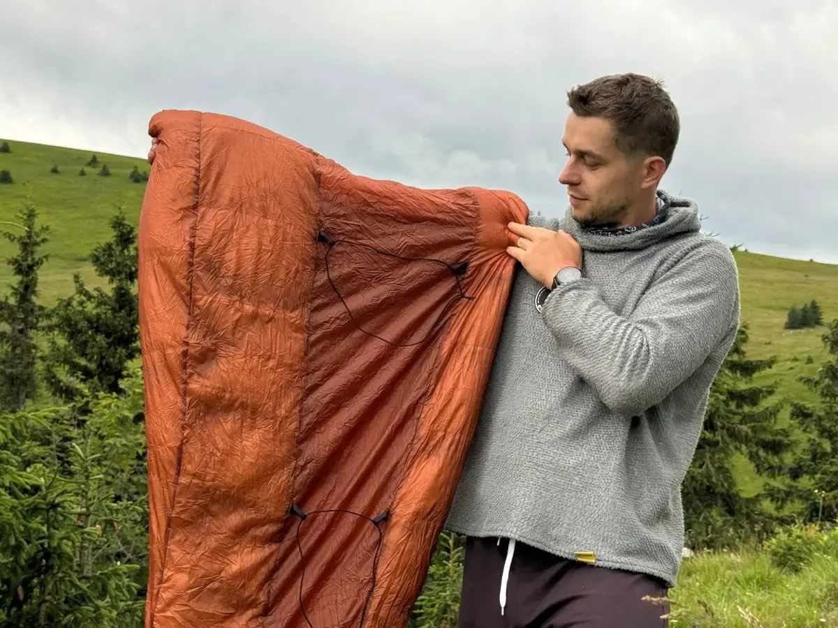 Cumulus Aerial 250 má hybridní konstrukci, která spojuje výhody klasického spacího pytle a quiltu. Aerial má klasický mumiový střih uzavřeného spacáku bez zipu, ale v zadní části je zbaven péřové výplně a tvoří ji pouze jedna vrstva tkaniny Toray Airtastic. Podobně jako u quiltu tedy chybí na zádech peří, protože stlačené peří ztrácí loft, neizoluje a prakticky nemá smysl. Od země tě izoluje karimatka, na rozdíl od quiltu se jí ale přímo nedotýkáš.
