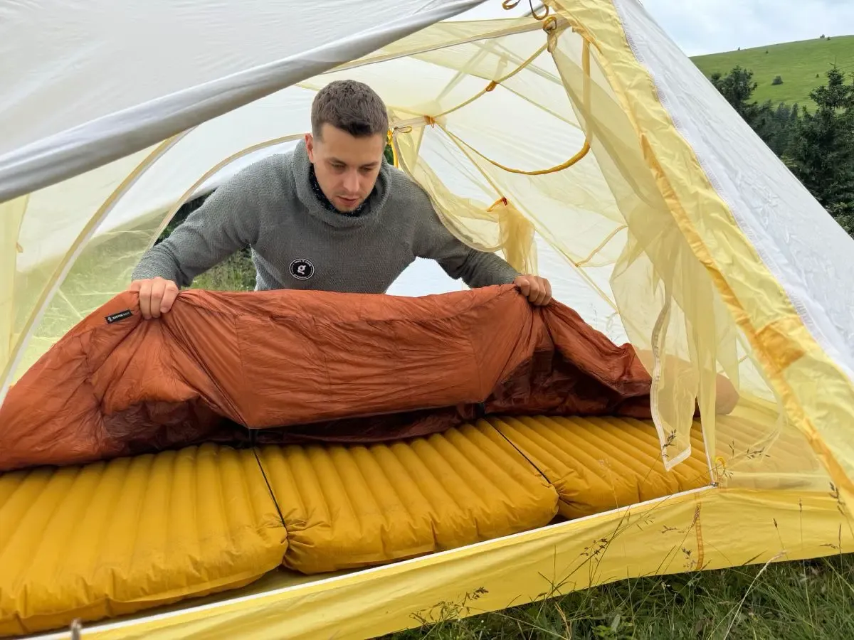 Aby se s tebou spacák při vrtění v noci neposouval, připevníš ho podobně jako quilt pomocí šňůrek ke karimatce. Tento jednoduchý systém připevnění zajistí, že spacák zůstane po celou dobu ve správné poloze se zádovou částí na karimatce a ty se v něm můžeš volně otáčet.
