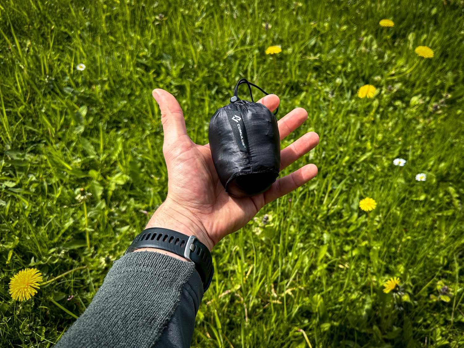 K papučím dostaneš také skladovací vak (stuff sack). Sbalené papuče zabírají objem 0,2 l.