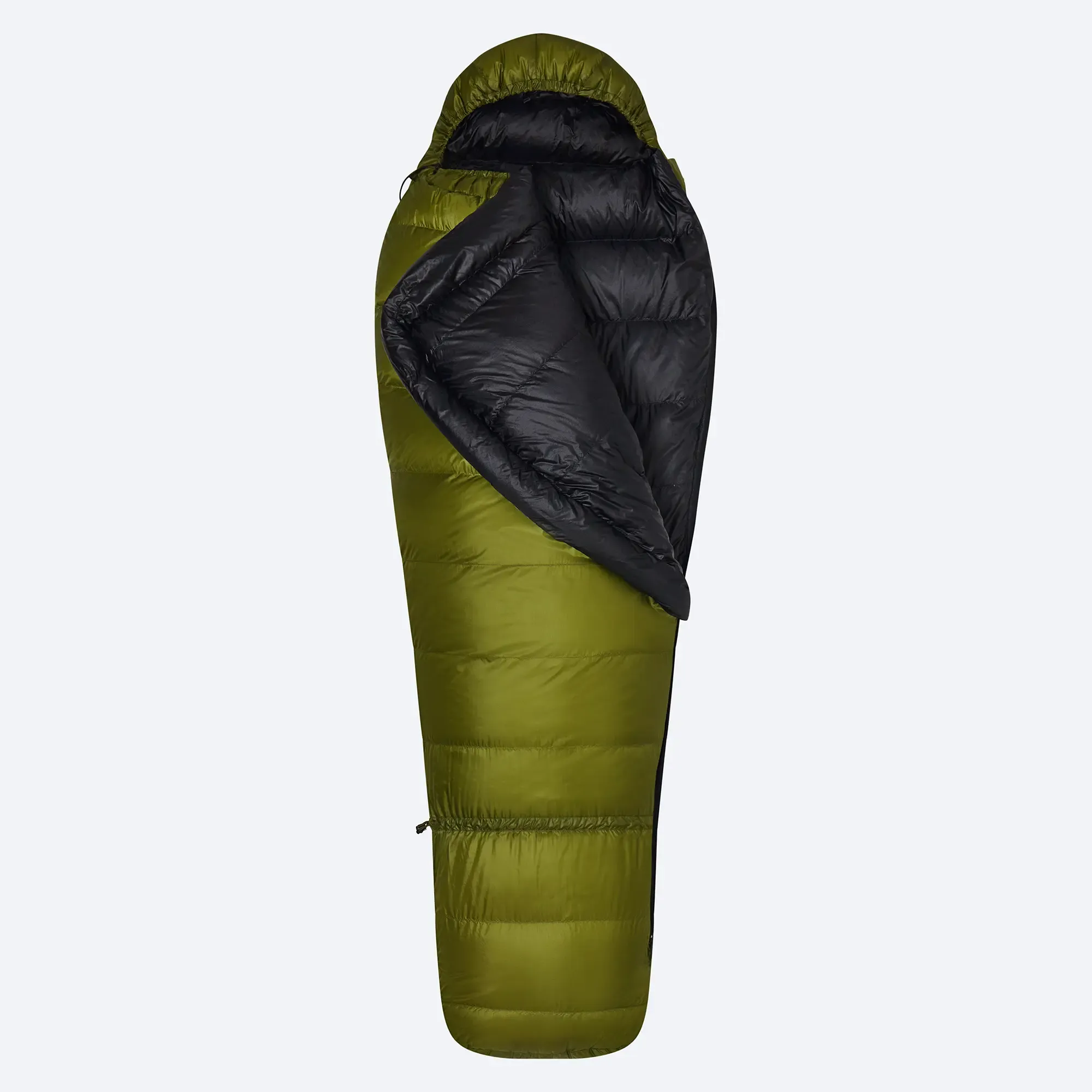 O skvělý výkon se stará 300 gramů husího prachového peří s plnivostí 850 cuin. Poměr prachového peří k malým pírkům je 95/5. Horní komory jsou odděleny od spodních a jsou naplněny o píď větším množstvím peřím. Peří je zde rozděleno v poměru je 55/45. Celková hmotnost spacáku je 550 g.