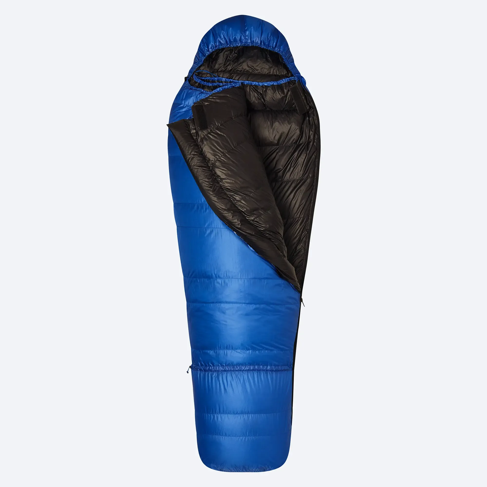 Pro jednoduchou orientaci je stahování kapuce a límce odlišeno, kapuci stahuješ plochým popruhem a límec gumičkou. Poslední komora u krku je naplněna větším množství peří, vytváří tak příjemný límec, který zabraňuje únikům tepla. Uvnitř spacáku je síťová kapsa na drobnosti.