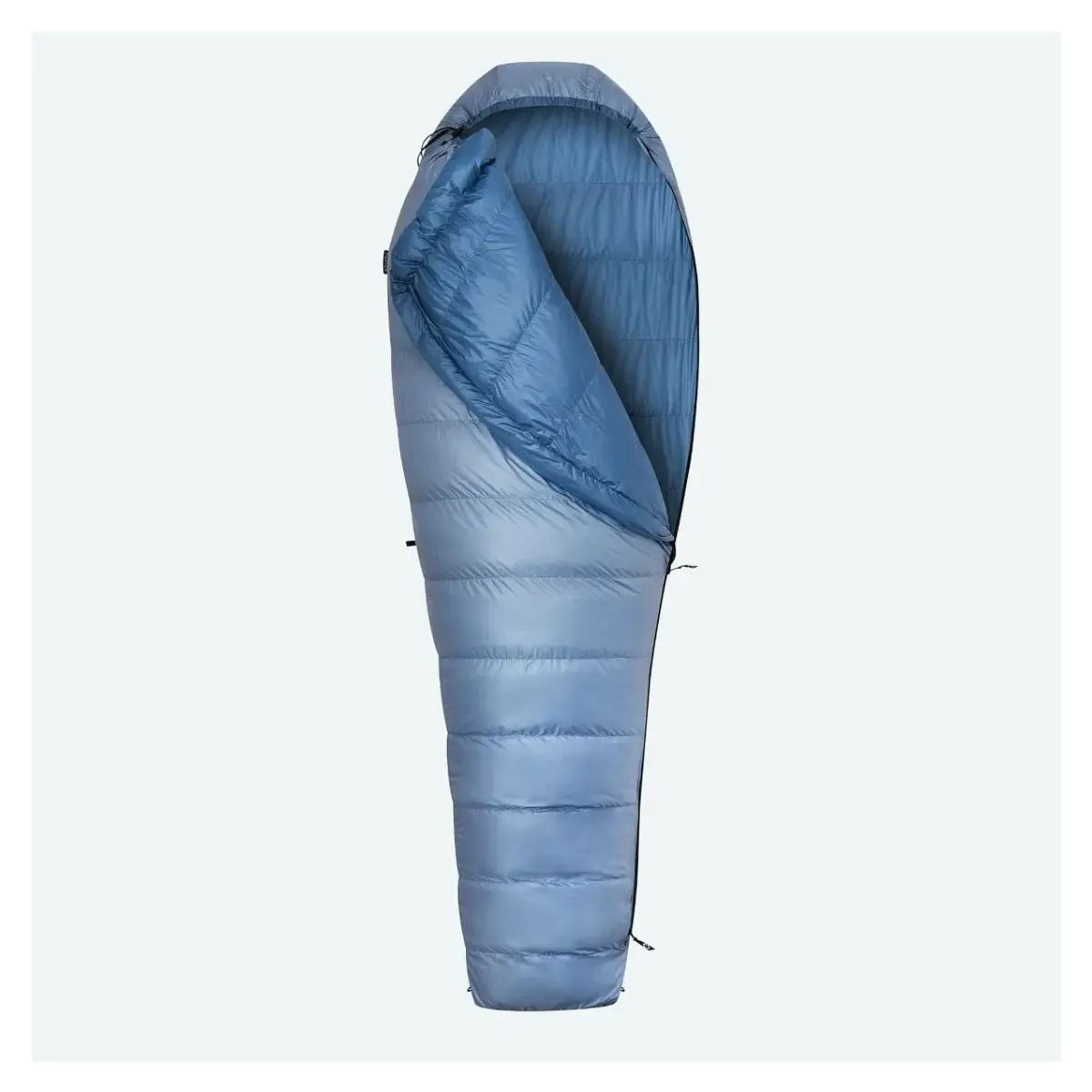 Pro jednoduchou orientaci je stahování kapuce a límce odlišeno, kapuci stahuješ plochým popruhem a límec gumičkou. Poslední komora u krku je naplněna větším množství peří, vytváří tak příjemný límec, který zabraňuje únikům tepla. Uvnitř spacáku je síťová kapsa na mobil, špunty do uší či jiné drobnosti.