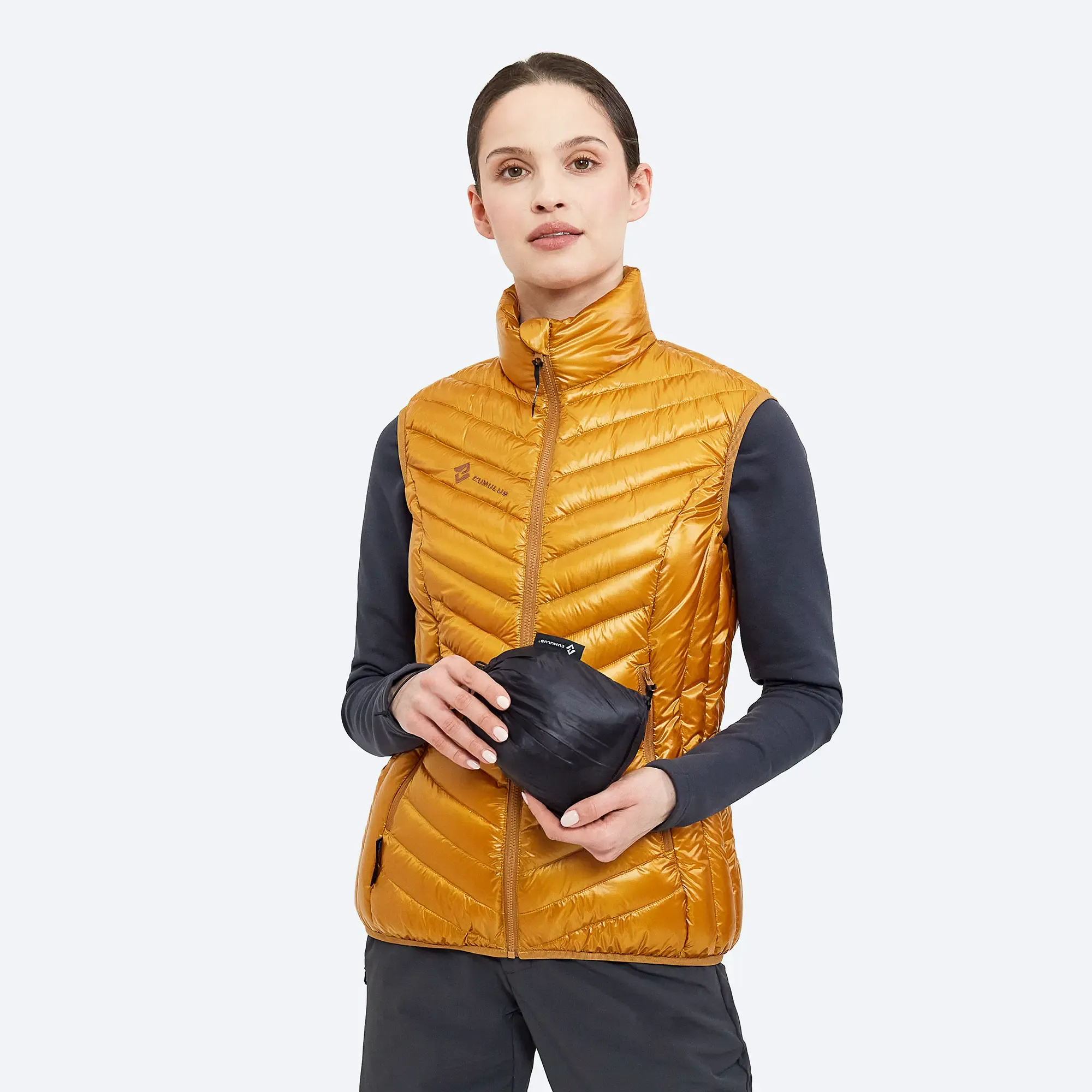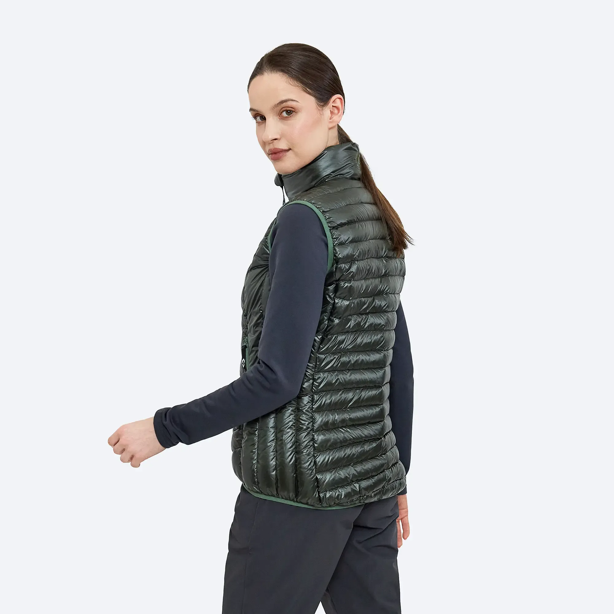 péřová zateplovací vesta, husí peří, hmotnost peří 50 g, plnivost 850 cuin, vnější látka Pertex Quantum DWR (29 g/m²), prošitá konstrukce komor, 3 mm YKK zip, 2 vnější boční kapsy na zip, vnitřní síťovaná kapsa, přiléhavý límec, sbalitelnost do kapsy, skladovací vak o objemu 0,5 l