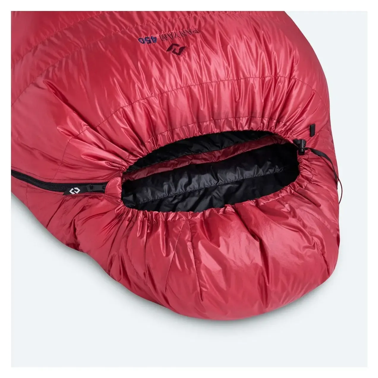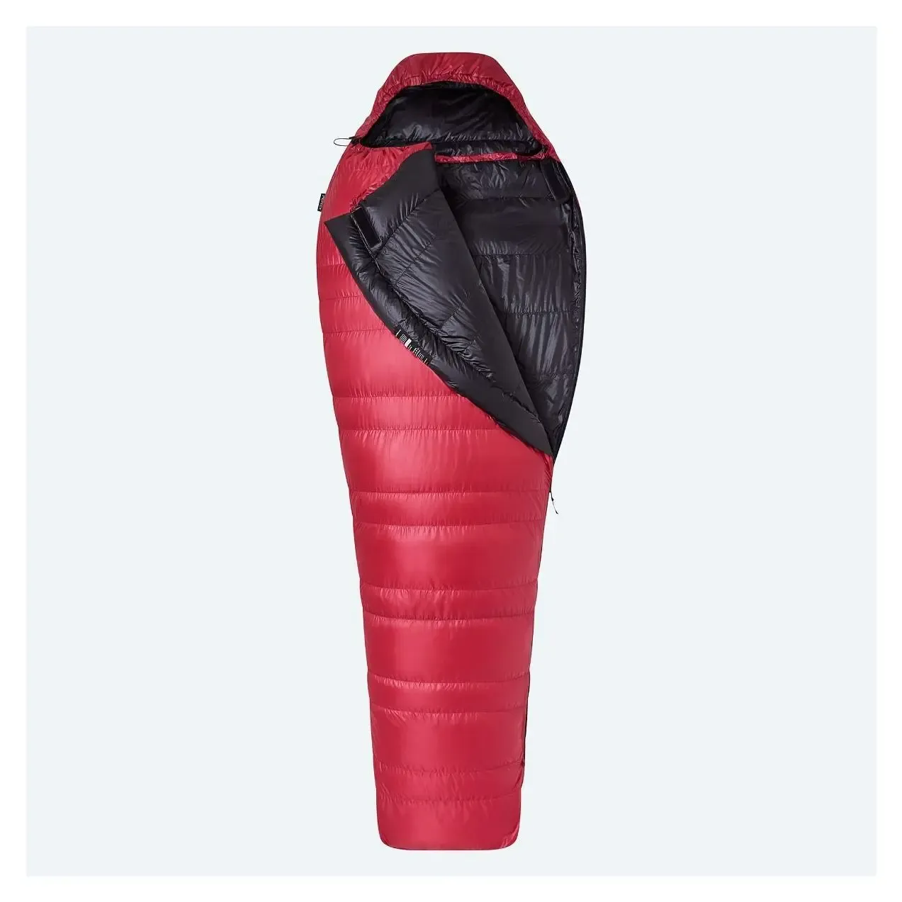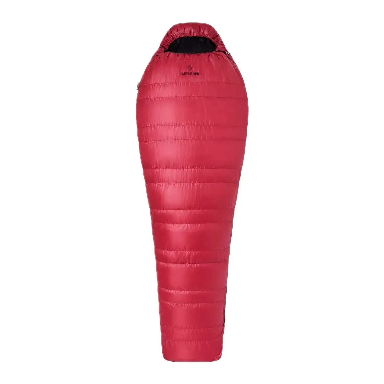 hmotnost peří 450 g, husí peří, plnivost 850 cuin, třísezónní, materiál Pertex Quantum s DWR, mumiový tvar, trapézové komory, kapuce a límec se stahováním, YKK zip se dvěma jezdci, podélná péřová komora za zipem, konstrukce footboxu Shark-fin, vnitřní kapsa na drobnosti, rozložení peří v komorách 55:45, součástí balení skladovací vak a cestovní obal o objemu 6,6 l
