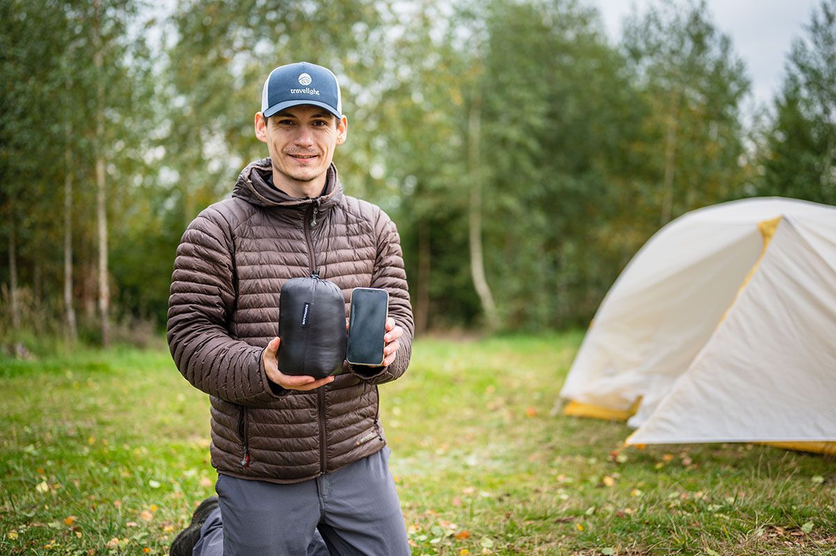 Ke quiltu je dodáván jednoduchý cestovní skladovací vak. V něm má tvar válce o objemu 1,5 litru a s rozměry 18/11 cm (výška/průměr).