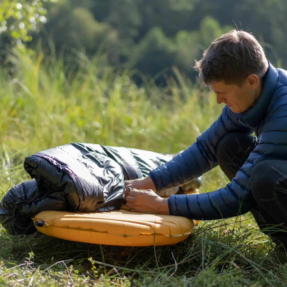 O izolaci od země se stará tvá karimatka. Aby otvor na zádech zůstal po celou dobu pod tebou, připevňuje se quilt ke karimatce pomocí elastických popruhů. Quilt zůstává celou dobu v základní poloze a ty se otáčíš v něm. Quilt lze používat s jakýmkoliv typem karimatky (nafukovací, pěnová). Quilt zároveň nemá kapuci, tu můžeš nahradit čepicí nebo péřovkou/mikinou s kapucí.