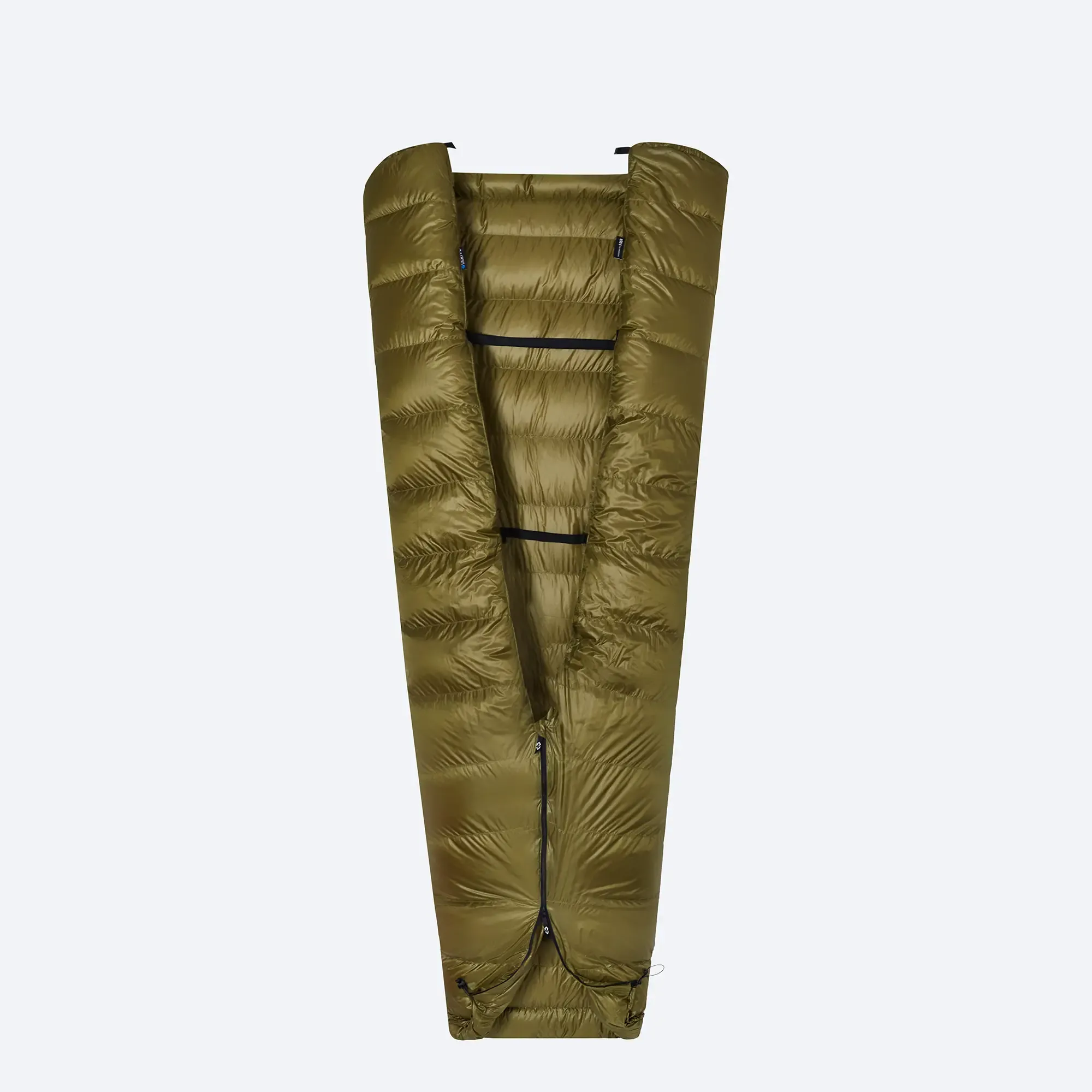 Pro úsporu hmotnosti a zvýšení efektivity jsou quilty zbaveny všeho nepotřebného. Na jeho zadní straně od pasu nahoru je odstraněno neefektivně využité peří, které by bylo většinu času slehlé pod tvým tělem a prakticky by nemělo žádný význam.