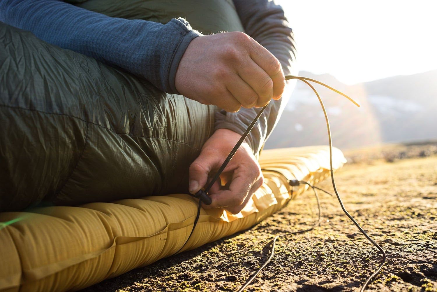 Quilt se připevňuje ke karimatce pomocí dvou plochých elastických popruhů, které nejprve navlíkneš na karimatku a pak připneš quilt. Šířku otvoru na zádech si můžeš nastavovat posouváním klipů po elastickém popruhu. Za krkem si jej můžeš sepnout a stáhnout. Na horním okraji je komora naducaná peří, která po stažení quiltu vytvoří límec kolem krku.