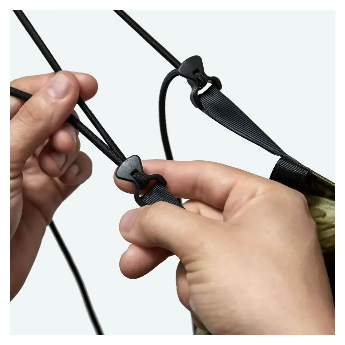 Intuitivní závěsný systém s elastickými šňůrami umožňuje přesné nastavení pod hamaku, minimalizuje vznik průvanu a zajišťuje pevné uchycení.