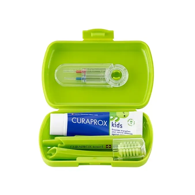 Travel set Kids od švýcarské firmy Curaprox je ultralehký a skladný cestovní set pro dentální hygienu dětí. Obsahuje vše potřebné pro každodenní péči o dětské zuby a dásně. Díky praktickému balení se vejde i do menších kapes. Celý set váží jen 65 gramů. Jednobarevné balení s roztomilou nálepkou uvnitř si zamiluje každý malý cestovatel!