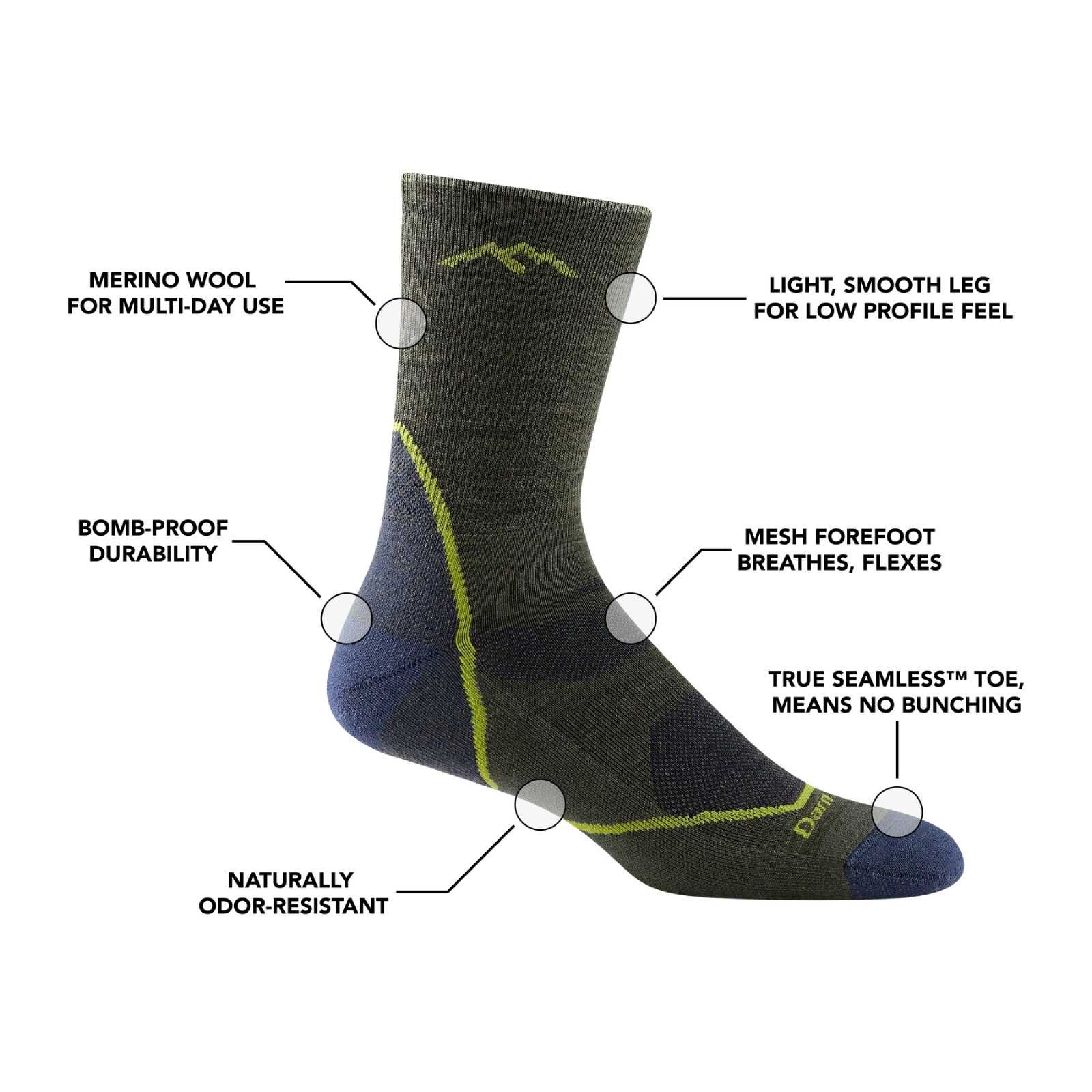 Merino ponožky Darn Tough Light Hiker Micro Crew Lightweight mají nižší gramáž a Micro Crew délku (nad kotník). Jsou ideální volbou pro období jaro až podzim a zvládnou jakoukoliv horskou túru či dálkový trek. Mají polstrování na chodidle a odvětrávací panely na nártu.