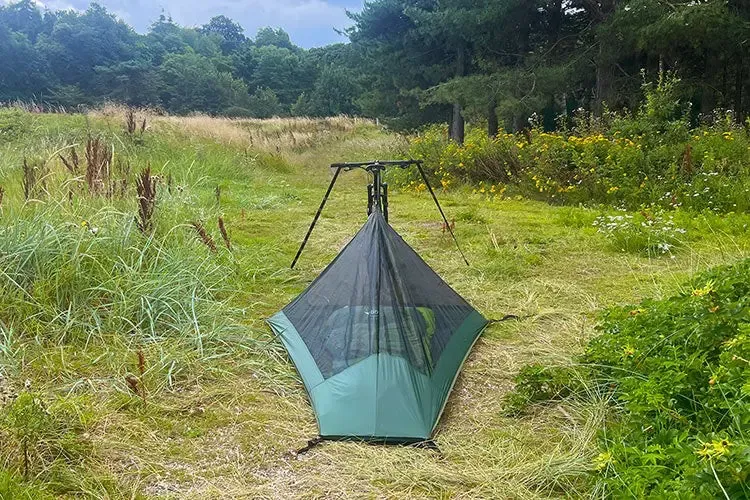 Vnitřní stan rozložíš pod postavený tarp a připneš pomocí poutek ke kolíkům. Špičku připevníš elastickou šňůrou k sedlu kola, čímž napneš moskytiéru. Díky tomuto jednoduchému a rychlému systému se vnitřní stan přizpůsobí téměř jakékoli výšce sedla.