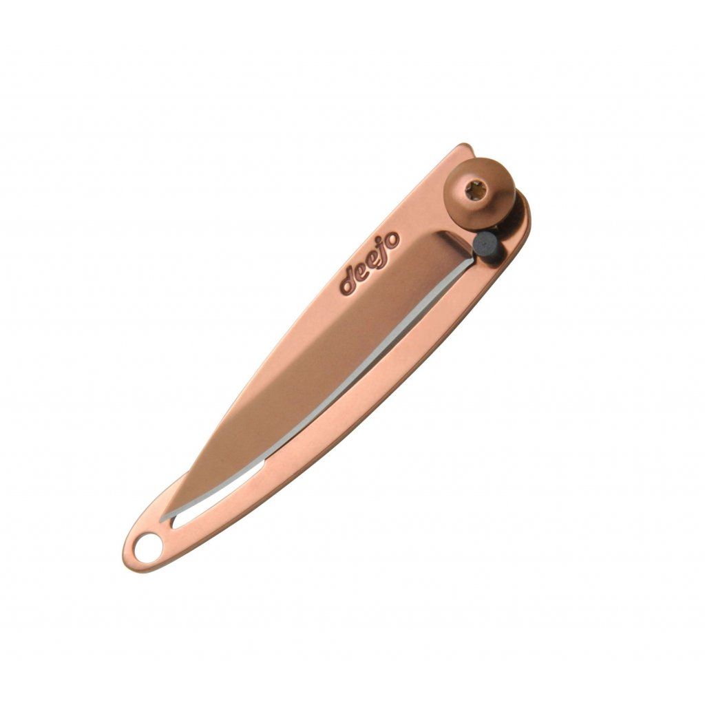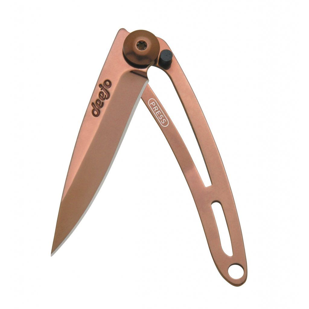Ultralehké a minimalistické nože od francouzské značky Deejo z ušlechtilé nerezové oceli jsou ideální na cestování, treky a výlety. Nabízí se ve třech velikostech (15 g, 27 g, 37 g) a různém provedení. Verze naked 15g mirror copper je městskou verzí tradičních outdoorových nožů, má lesklý povrch v barvě mědi.