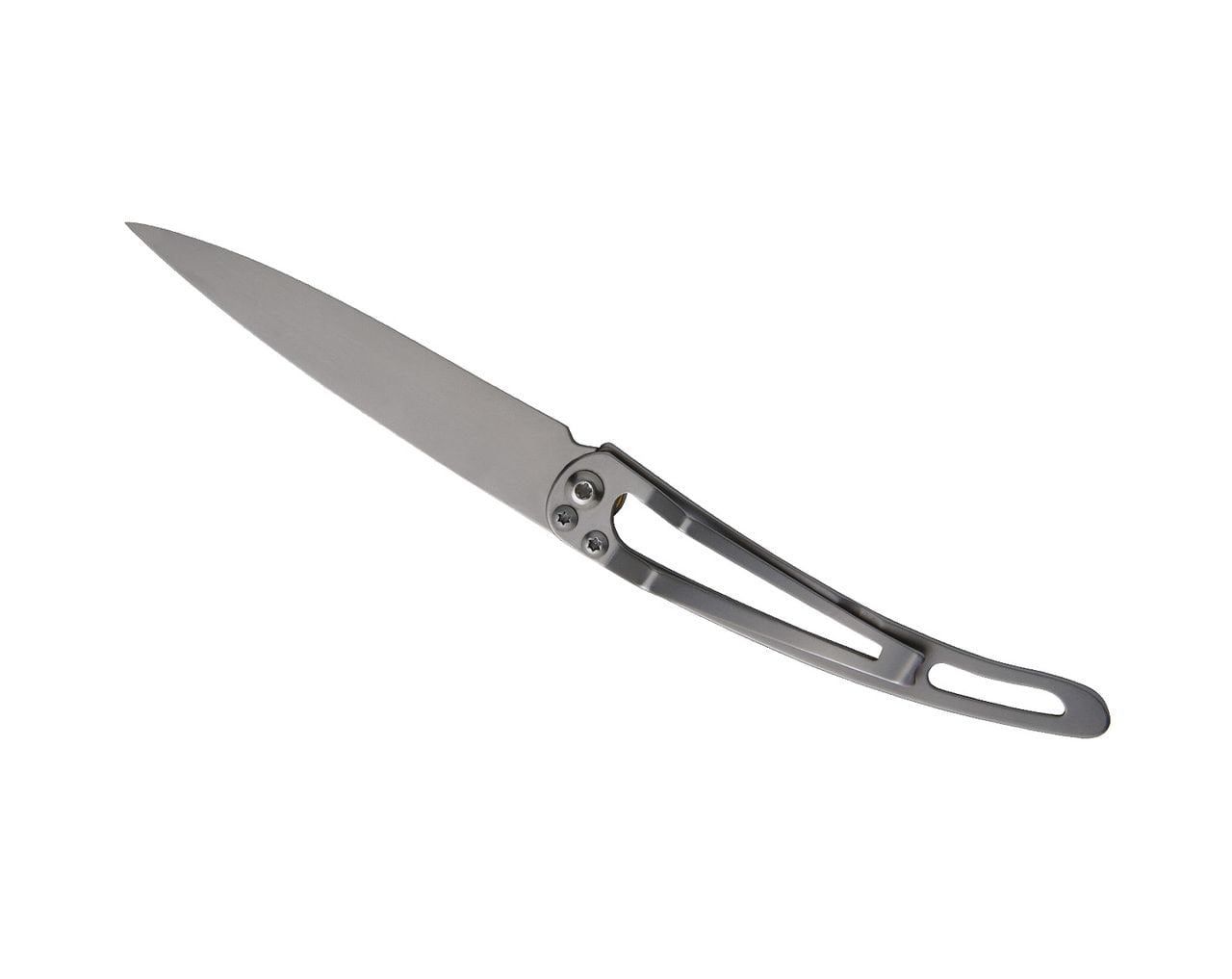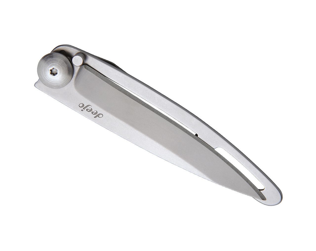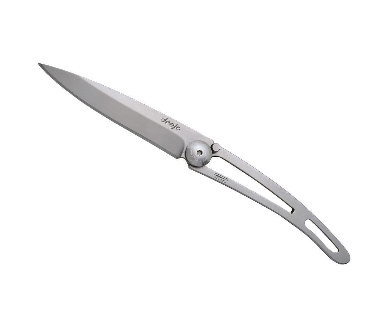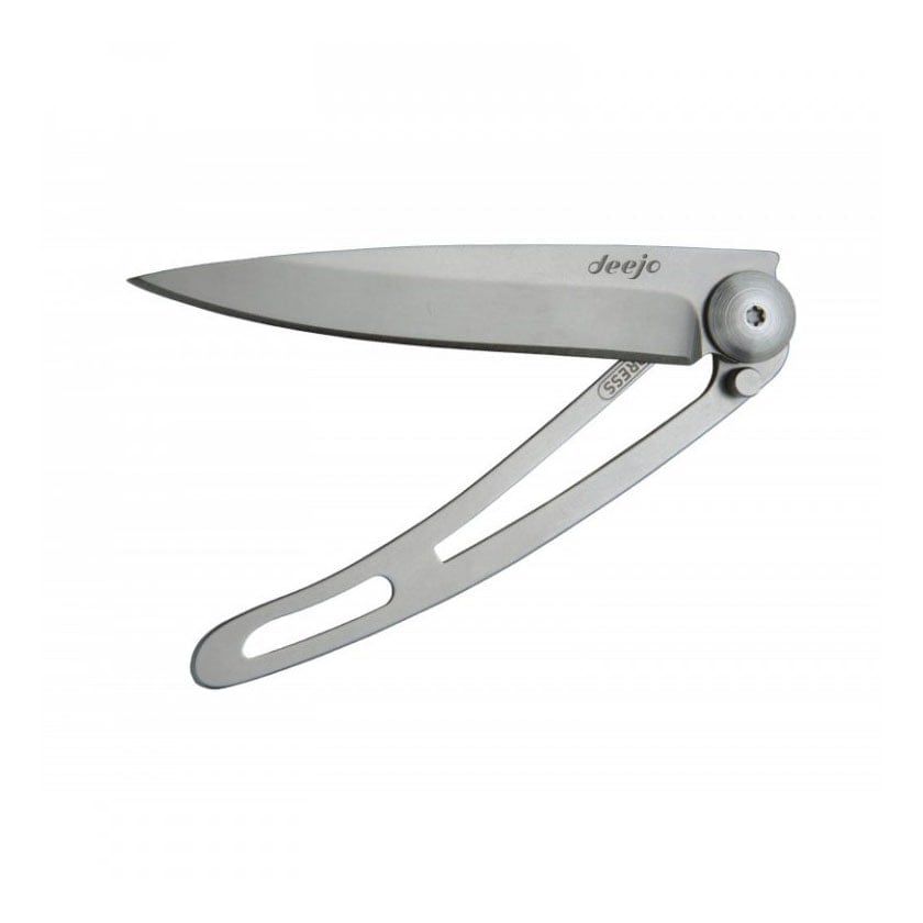 Ultralehké a minimalistické nože od francouzské značky deejo jsou ideální na cestování, treky a výlety. Nabízí se ve třech velikostech (15 g, 27 g, 37 g) a různém provedení. Kapesní nůž Naked 27g je tvořen 8 cm dlouhou čepelí, rukojetí, pojistkou a sponou pro připevnění.