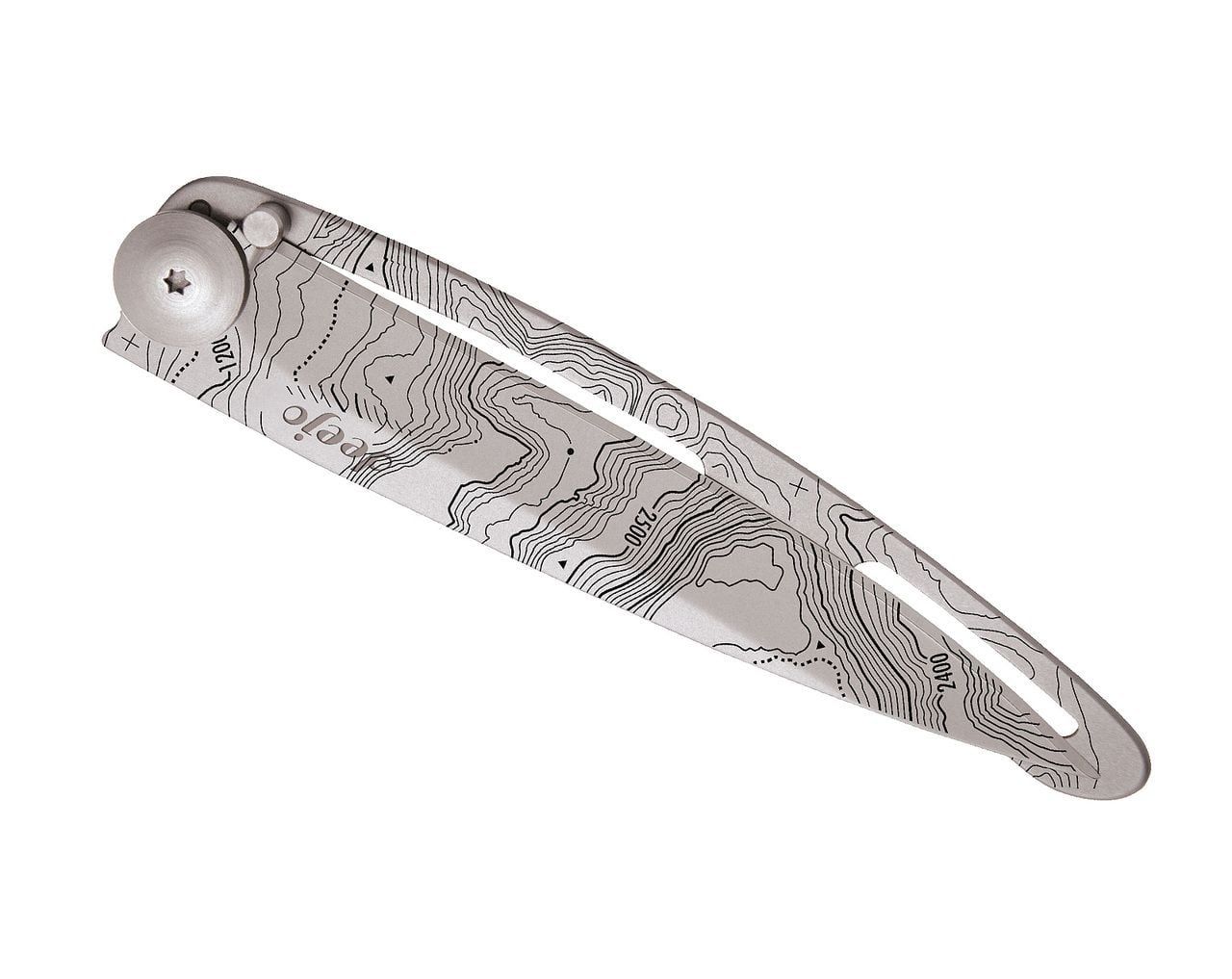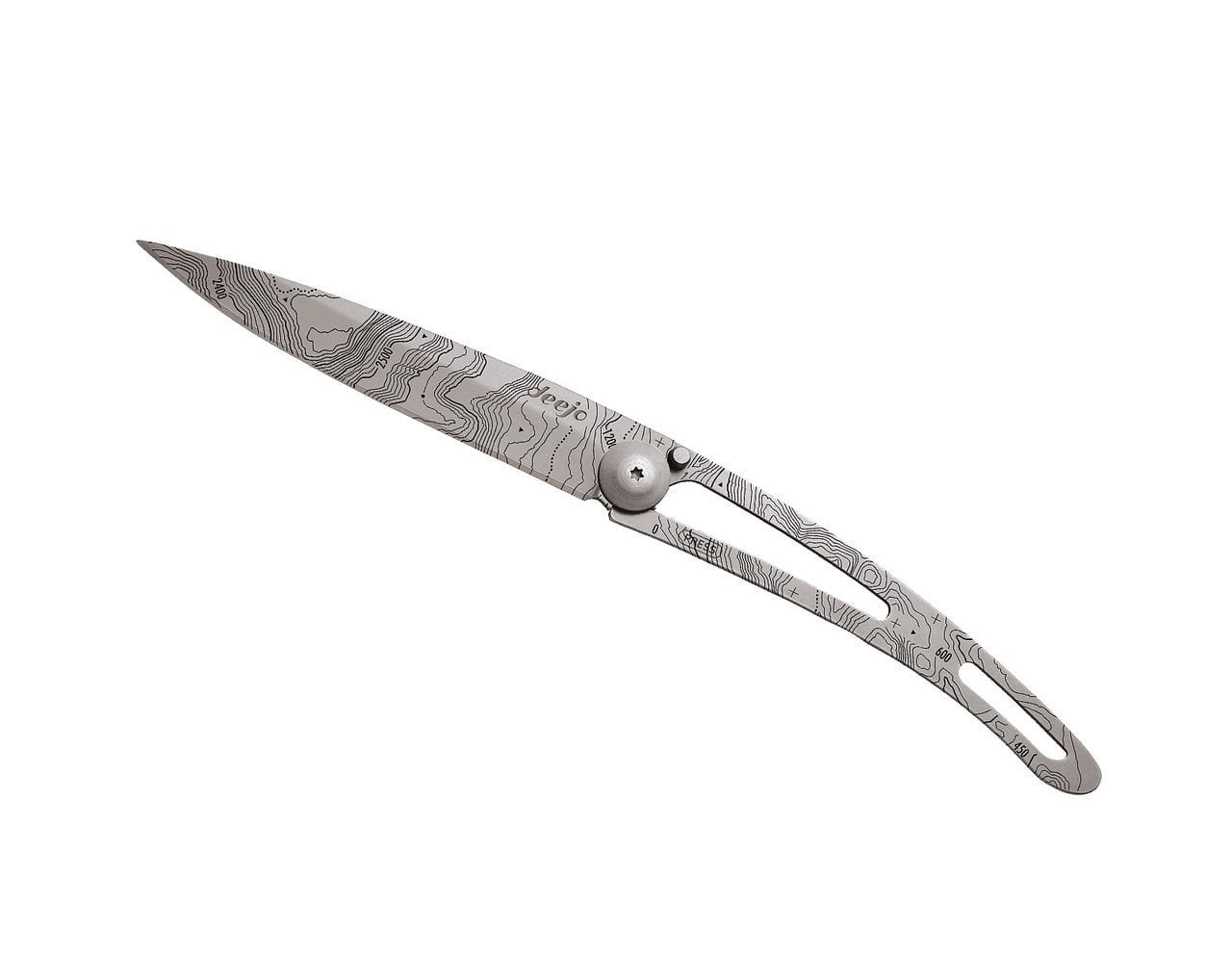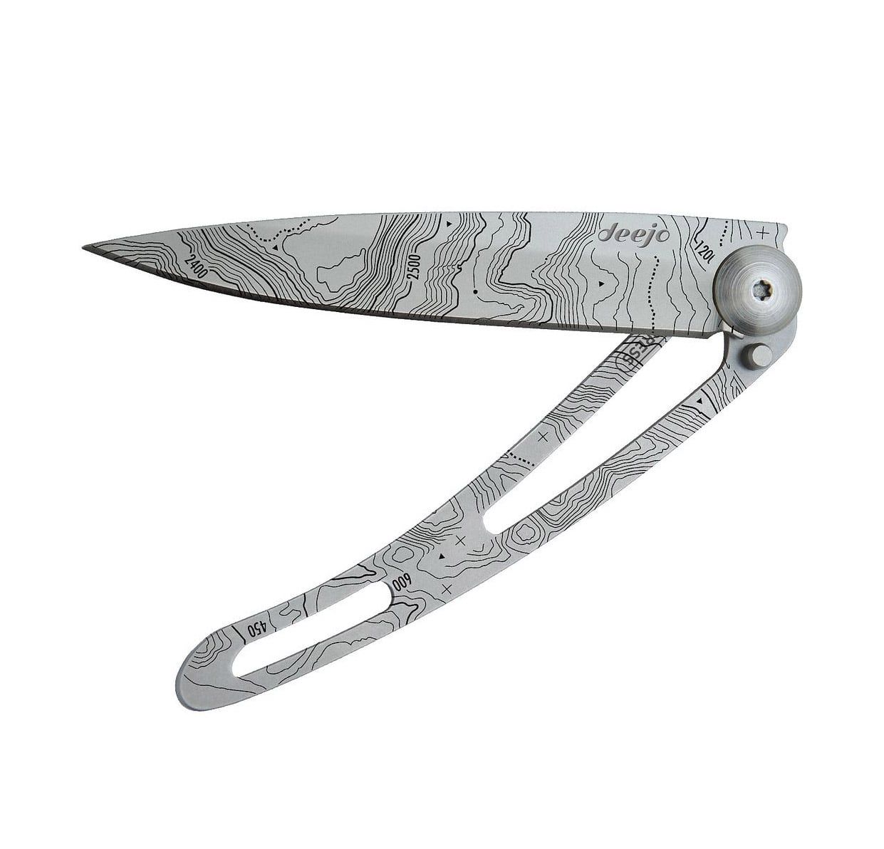 Ultralehké a minimalistické nože od francouzské značky deejo jsou ideální na cestování, treky a výlety. Nabízí se ve třech velikostech (15 g, 27 g, 37 g) a různém provedení. Naked 37g Tattoo Topography je největší verzí z kapesních nožů a je tvořen 9,5 cm dlouhou čepelí, rukojetí, pojistkou a sponou pro připevnění.