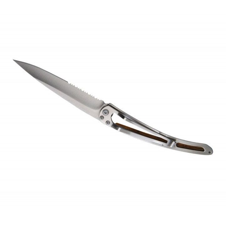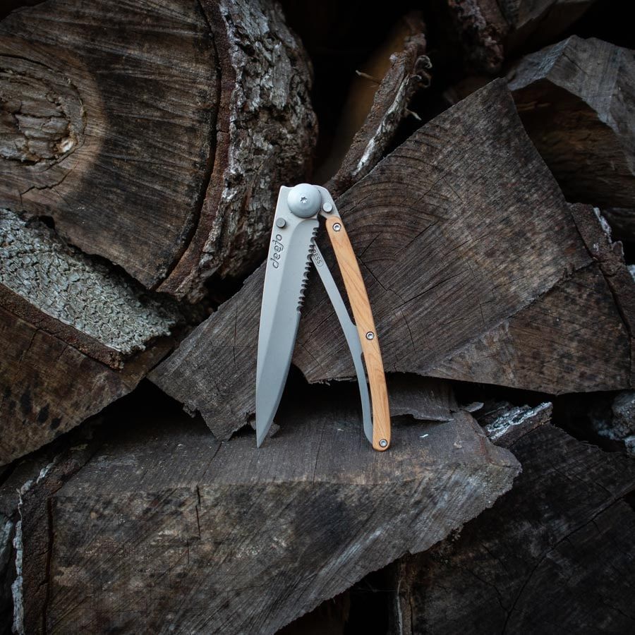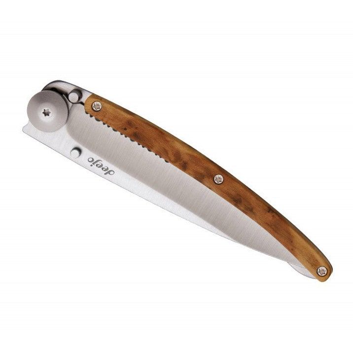 Ultralehké a minimalistické nože od francouzské značky Deejo jsou ideální na cestování, treky a výlety. Nabízí se ve třech velikostech (15 g, 27 g, 37 g) a různém provedení. Tento nůž vyniká částečně zubatou čepelí o délce 9,5 cm, rukojetí se střenkou z exotického jalovce, pojistkou a sponou pro připevnění.