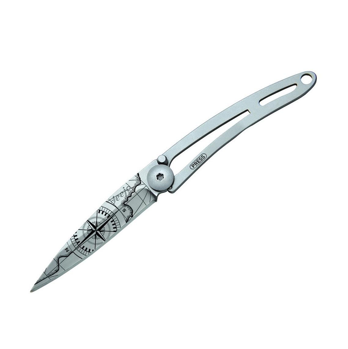 Ultralehké a minimalistické nože od francouzské značky Deejo jsou ideální na cestování, treky a výlety. Nabízí se ve třech velikostech (15 g, 27 g, 37 g) a různém provedení. Verze Tattoo 15g Terra Incognita Naked má na čepeli laserem vytetovaný motiv “Země neznámá”.