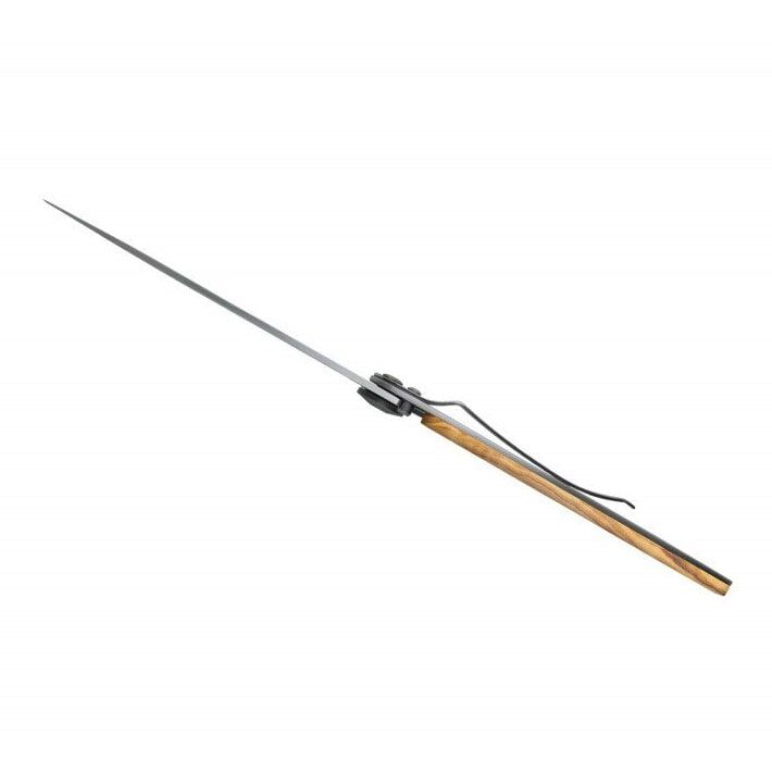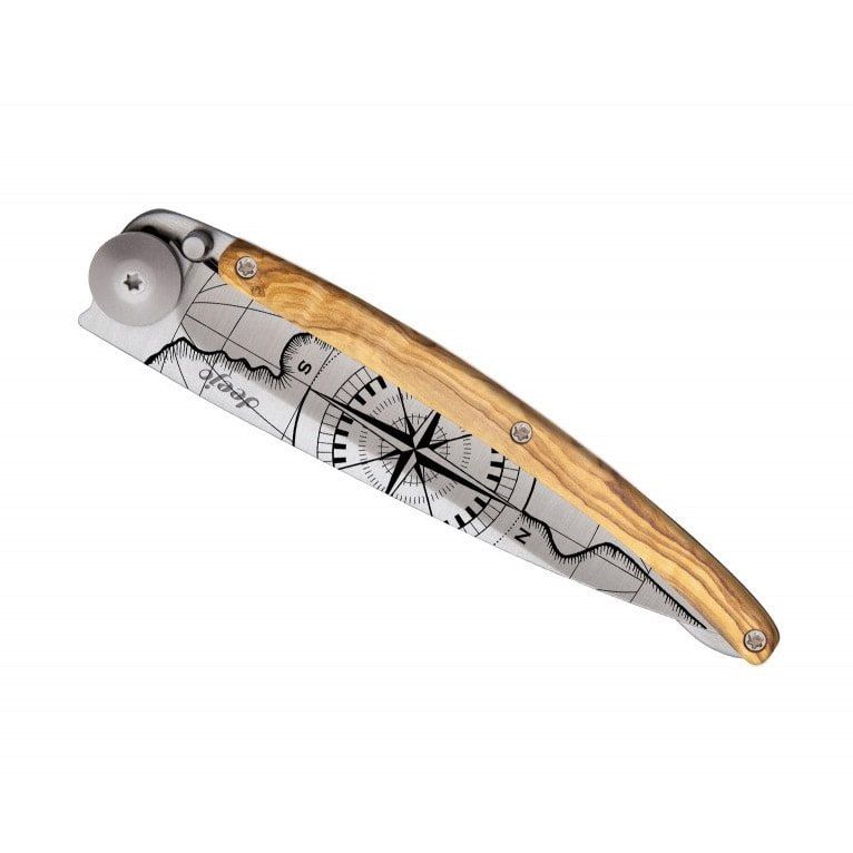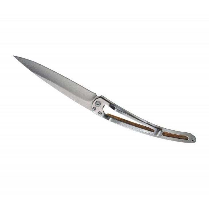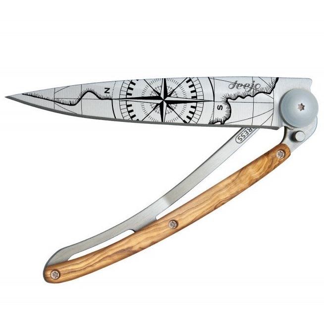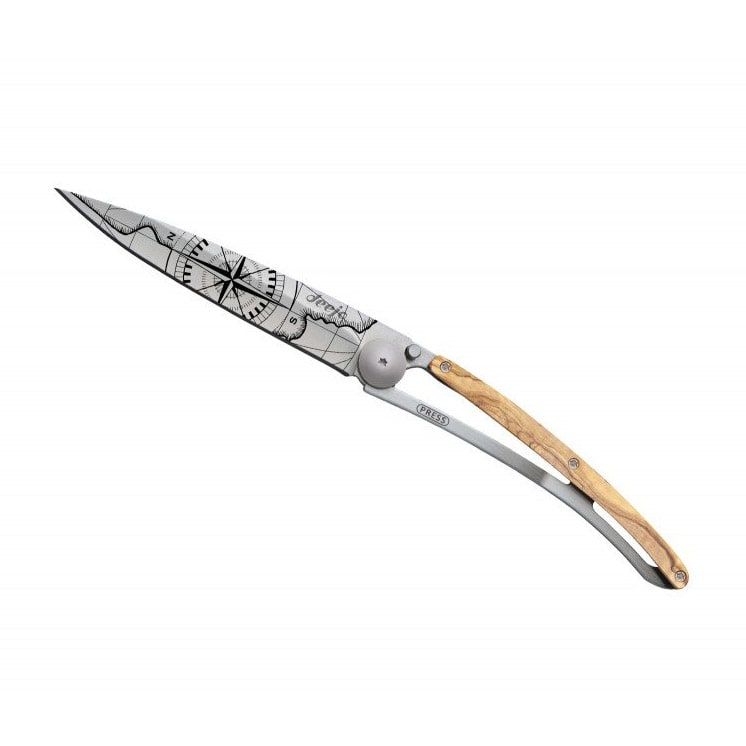 Ultralehké a minimalistické nože od francouzské značky deejo jsou ideální na cestování, treky a výlety. Nabízí se ve třech velikostech (15 g, 27 g, 37 g) a různém provedení. Tento nůž vyniká laserem vytetovaným motivem “Země neznámá”, střenkou z olivového dřeva, 9,5 cm dlouhou čepelí, rukojetí, pojistkou a sponou pro připevnění.