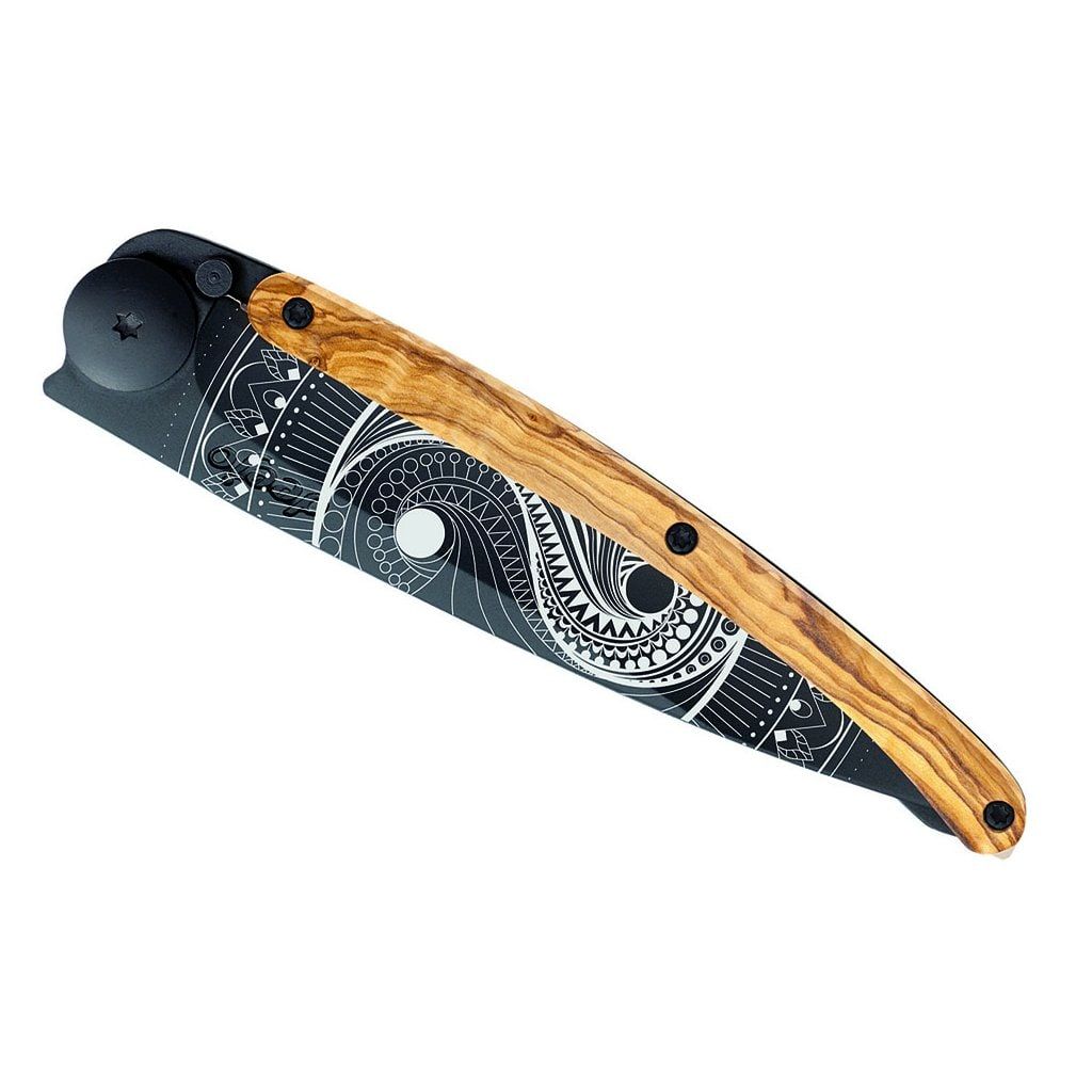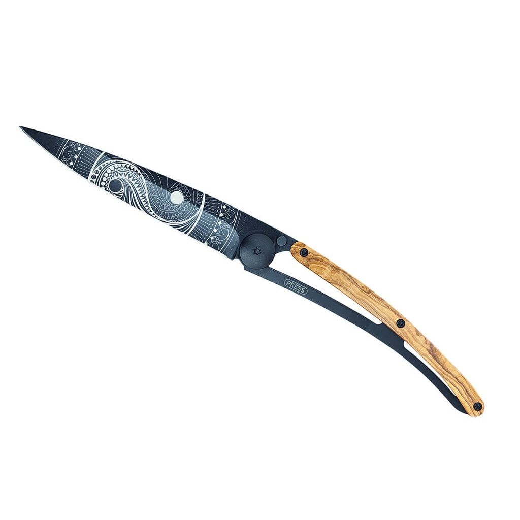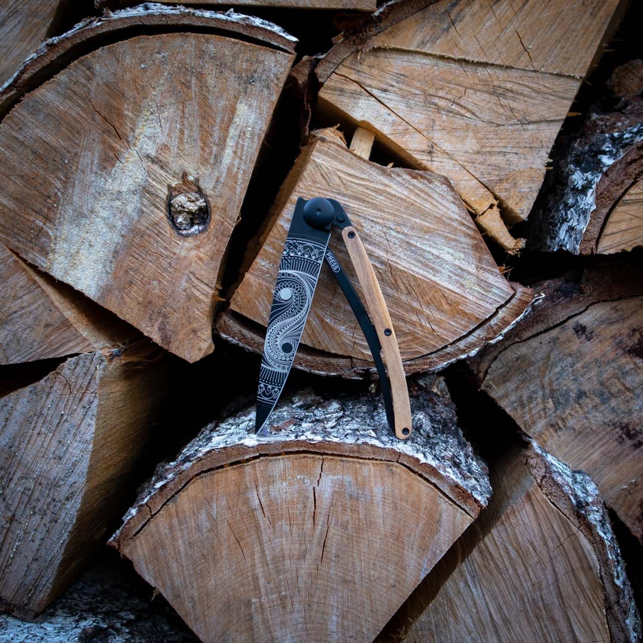 Ultralehké a minimalistické nože od francouzské značky Deejo jsou ideální na cestování, treky a výlety. Nabízí se ve třech velikostech (15 g, 27 g, 37 g) a různém provedení. Tento stylový nůž vyniká laserem vytetovaným motivem Yin Yang, 9,5 cm dlouhou čepelí v černé barvě a střenkou z olivového dřeva.