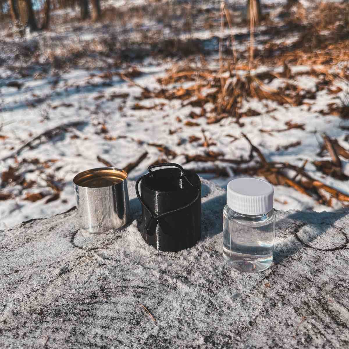 Černé ochranné pouzdro je vyrobeno z plastu a pro větší odolnost a lepší ochranu vařiče je dvoustěnné. Váží pouhých 28 gramů a je doplněno stahující gumičkou, díky které drží vařič v obalu a nevypadne. Rozměry obalu (80 mm x 60 mm) jsou přesně tak akorát, aby do něj vařič perfektně zapadnul. Z druhé strany obalu se vkládá malá průhledná plastová lahvička na tekutý líh s šroubovacím bílým uzávěrem o hmotnosti 13 gramů a objemu 60 ml. Takové množství lihu vystačí zhruba na půl hodiny vaření (15 ml paliva hoří přibližně 7-8 min při 25°C okolní teplotě vzduchu a bezvětří).