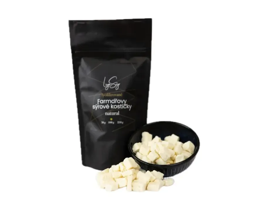 Lyofilizace je druh šetrné dehydratace – sýr se rychle zmrazí a ve vakuu se z něj odstraní voda bez zahřívání. Zůstane jen poctivý sýr – lehký, skladný a s dlouhou trvanlivostí, připravený na každý výlet.