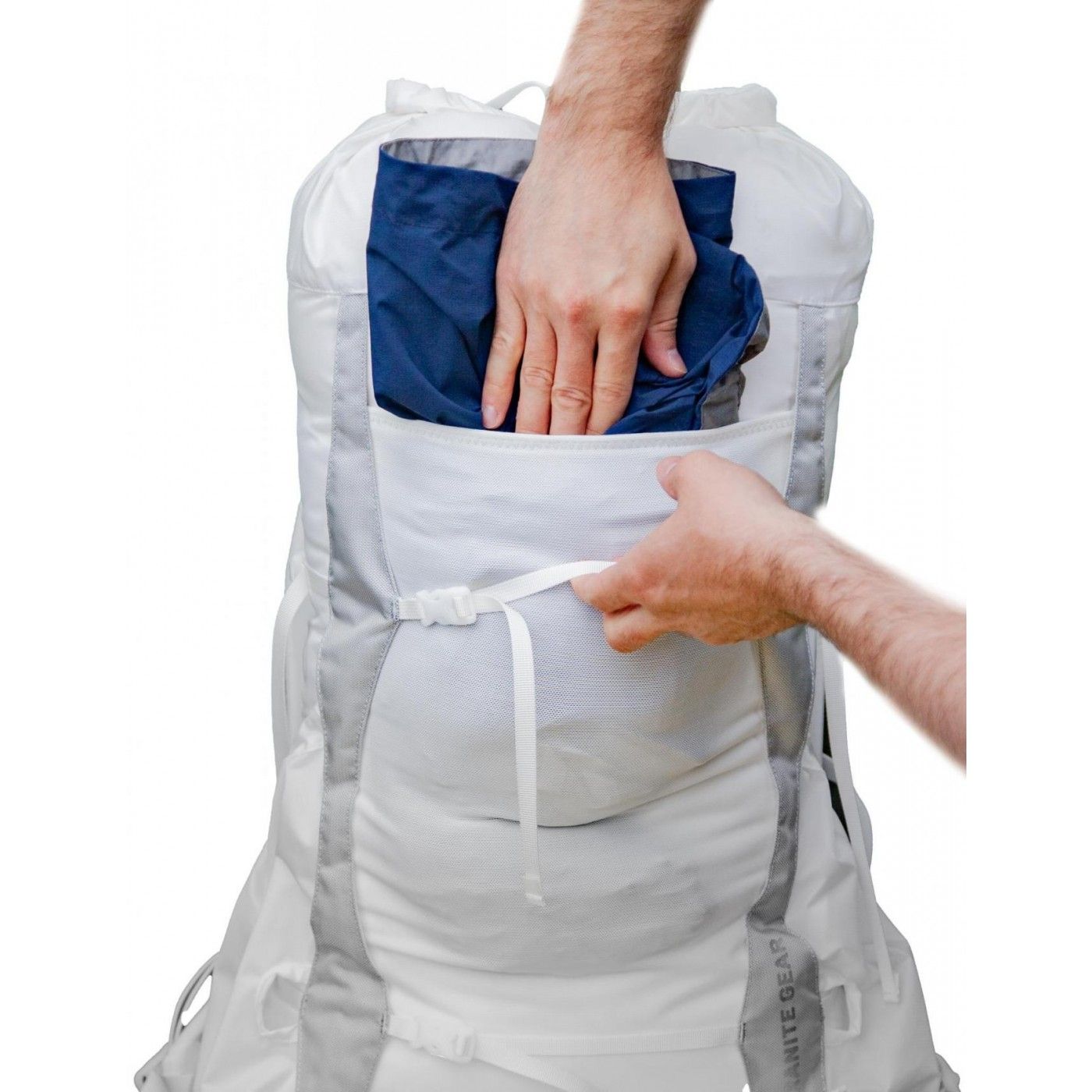 Na zadní straně batohu je velká pružná klokaní kapsa, ideální pro nepromokavou bundu, toaletní lopatku, filtr na vodu či další vybavení, které chceš mít rychle po ruce. Batoh je dále opatřen dvěma bočními pevnými kapsami z nylonu, do kterých jednoduše dosáhneš i za chůze. Navíc do nich krásně zapadnou lahve s vodou.