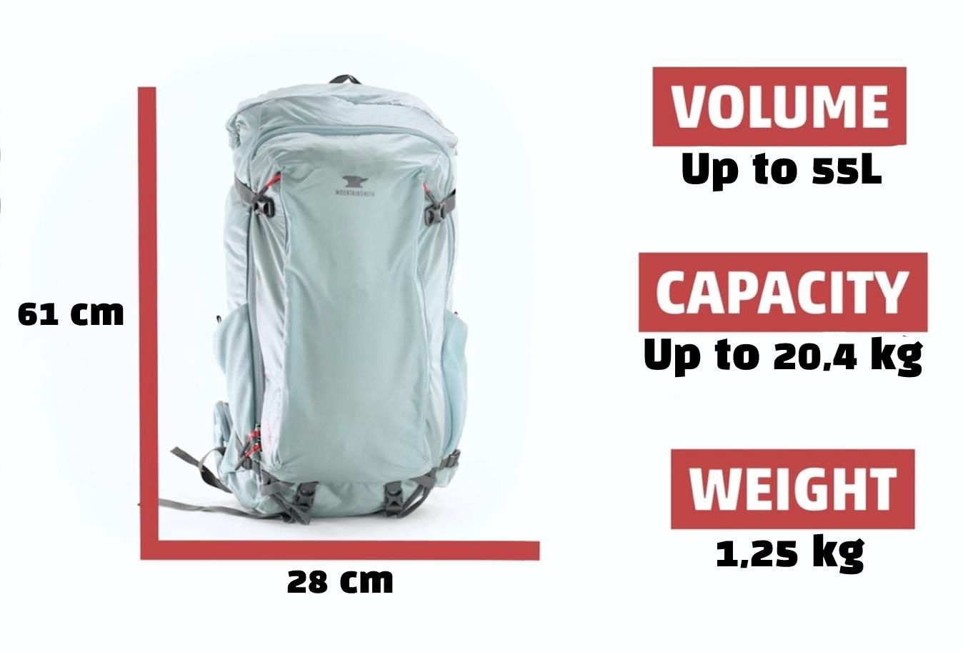 Celkový objem batohu je 55 litrů. Jeho nosnost je dle výrobce 20,4 kg.