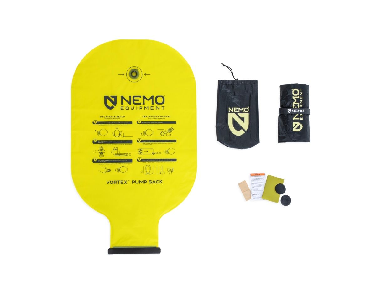 K samotné karimatce dostaneš v balení také opravnou sadu, pásku na suchý zip pro stáhnutí složené karimatky, malý skladovací vak a velký nafukovací Vortex vak pro rychlé a snadné nafouknutí.