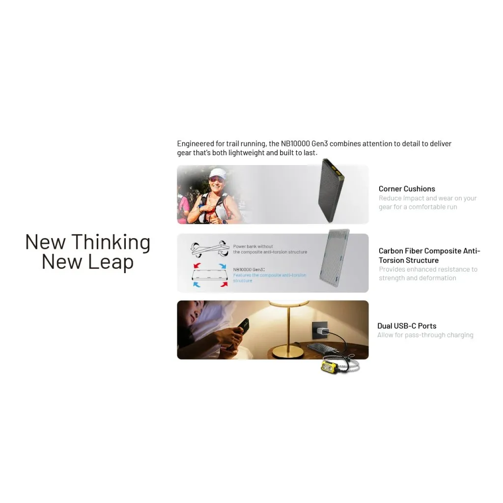 Nová generace nejlehčí powerbanky na světě (150 g) vyrobené z tvrzeného polymeru s příměsí sklených vláken, které snižuje její opotřebení. Nově je NB10000 GEN3 vybavena rohovými polštáři, dále se chlubí zvýšením nabíjecího výkonu a automaticky rozpoznatelným režimem nízkého proudu.