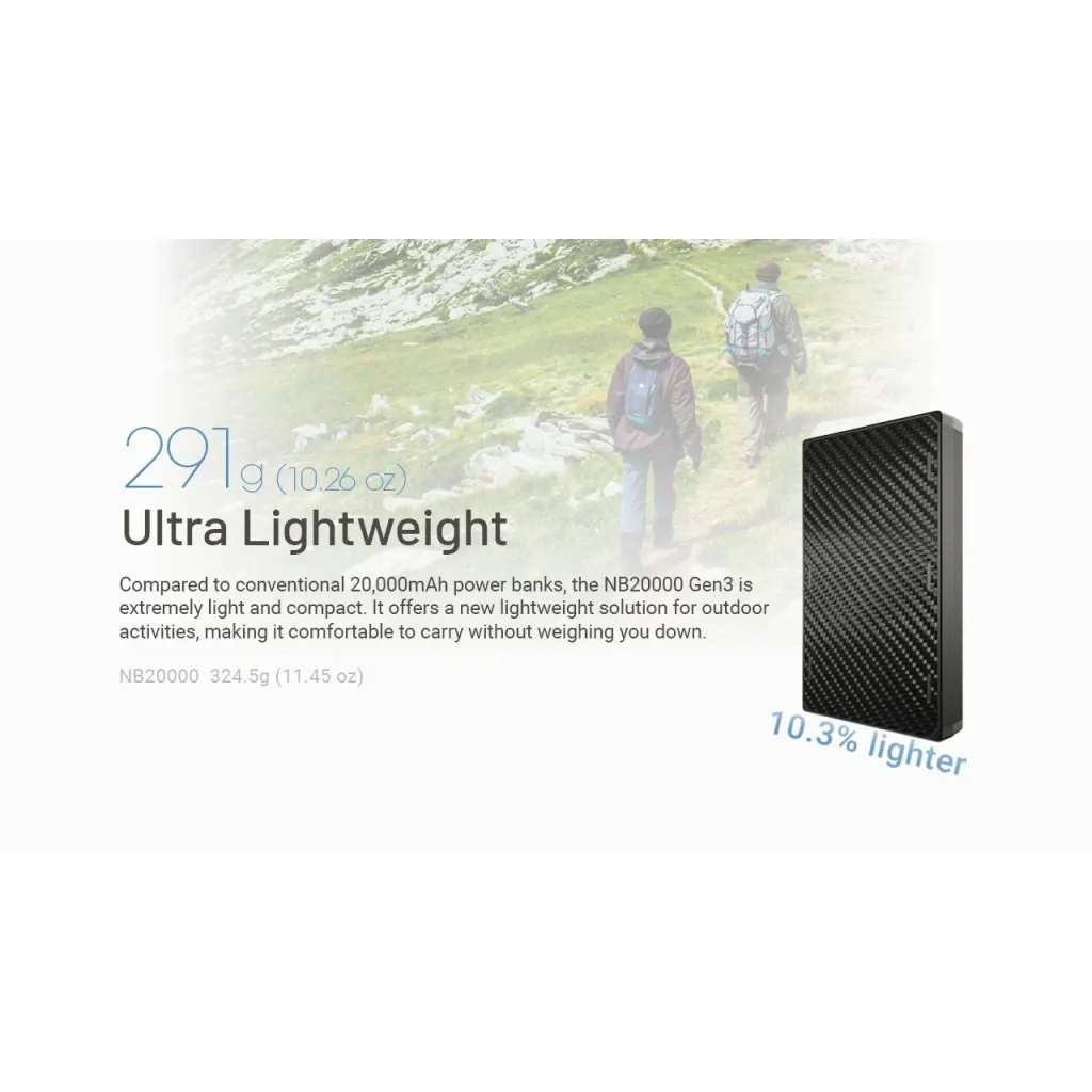 Nová generace NB20000 powerbanky vyrobené z tvrzeného polymeru s příměsí sklených vláken, které snižuje její opotřebení. Nově je GEN3 menší, lehčí (pouhých 291 g), vybavena rohovými polštáři a dále se chlubí automaticky rozpoznatelným režimem nízkého proudu.