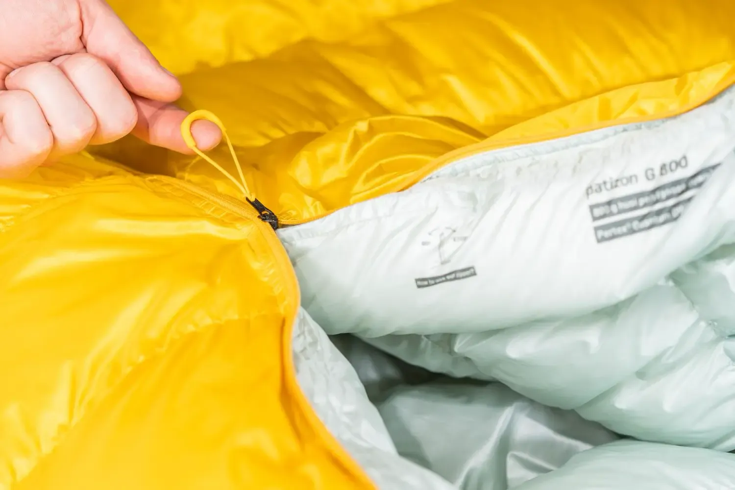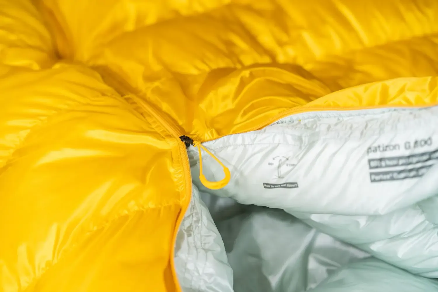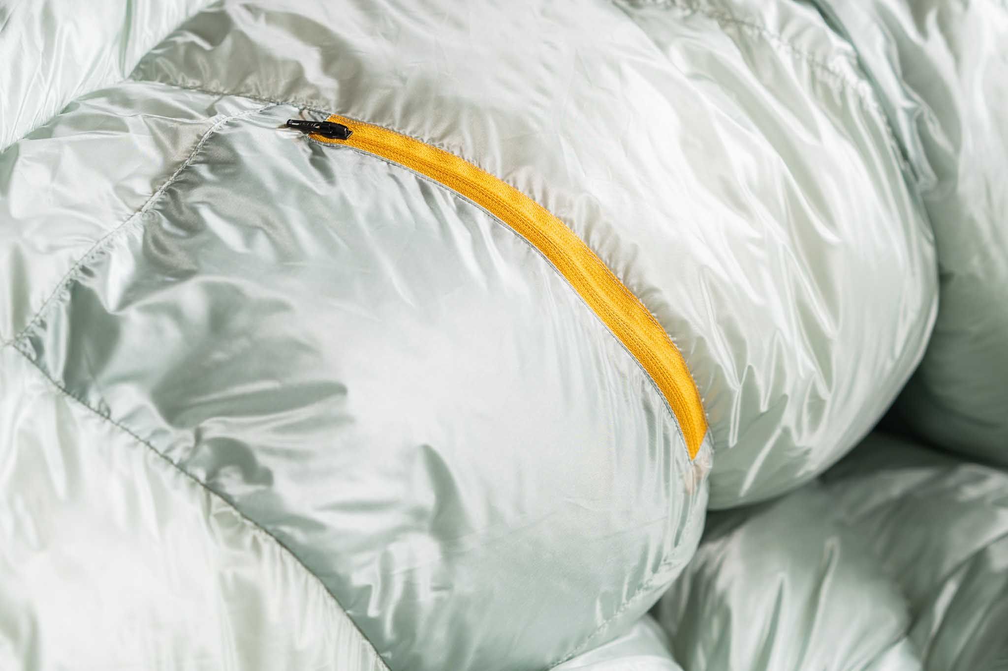 Kvalitní YKK zip je oproti konkurenčním spacákům mnohem jemnější (hrubost 3 mm oproti běžným 6 mm) pro snížení hmotnosti a tepelných úniků. Zip pracuje ve dvou polohách. V poloze GO se zip jednoduše rozjíždí taháním za látku. V poloze STOP je zip zablokovaný a nerozjíždí se. Díky zipu se dvěma jezdci můžeš teplejších podmínkách jednodušeji regulovat teplotu ve spacáku.