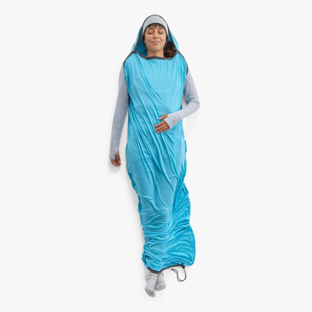 Mumiový tvar vložky přirozeně kopíruje křivky lidského těla a krásně padne do mumiového spacáku. Límec a kapuci si jednoduše přizpůsobíš pomocí stahovacího lanka. Také spodní část je vybavena stahovacím lankem Drawcord a umožňuje prodloužení a větrání v oblasti nohou. Vložku si můžeš navíc zapnout tak, že budeš používat kapuci a zároveň máš ruce venku. Součástí balení je i praktický cestovní vak.