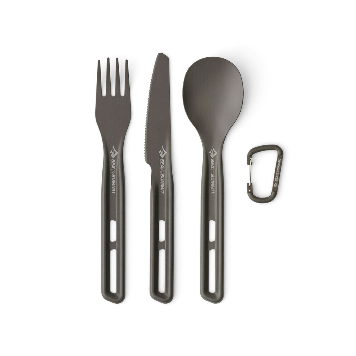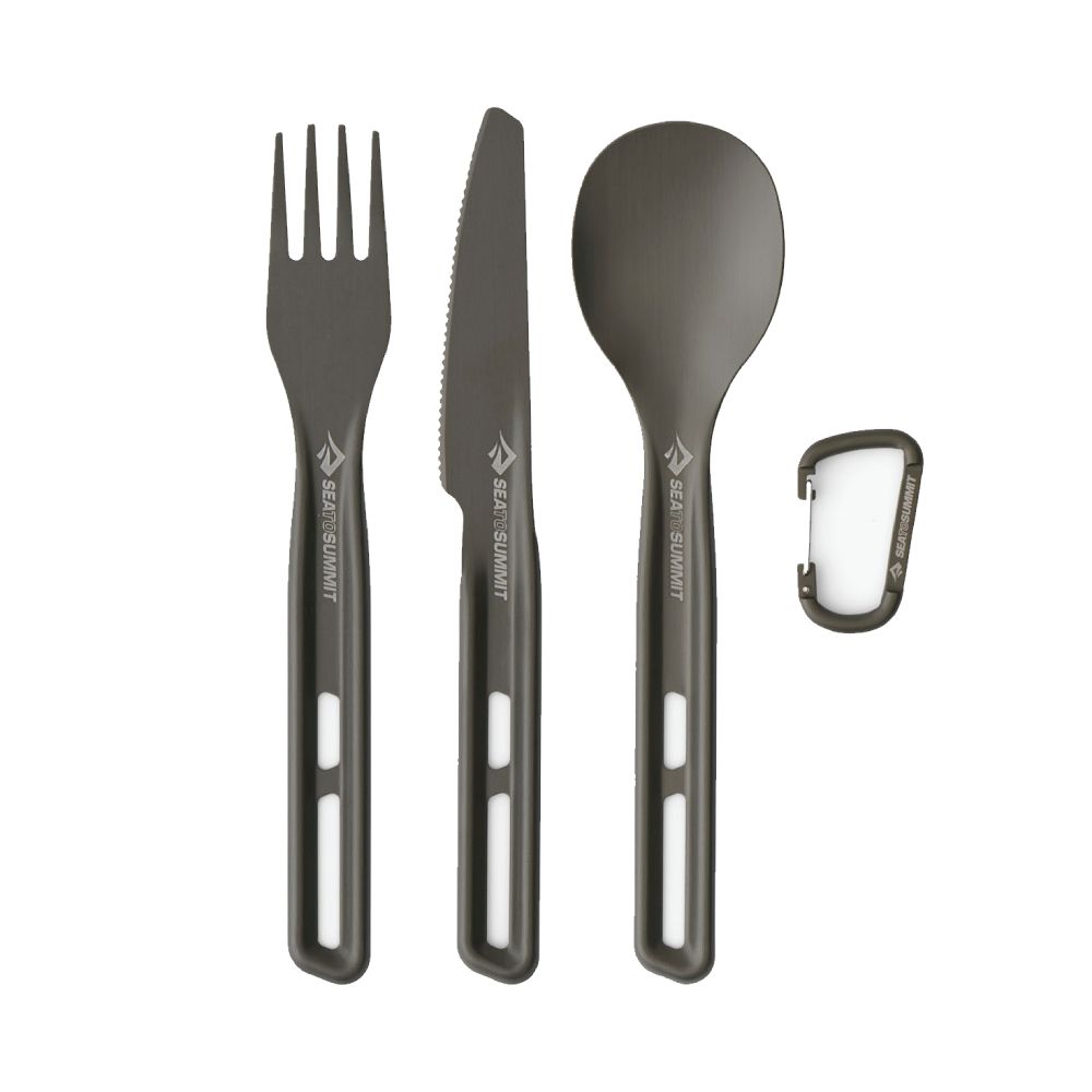 Ultralehká a velmi odolná sada příborů s matným povrchem z letecké slitiny hliníku. Balení obsahuje lžíci, vidličku, nůž a karabinu pro zavěšení nebo připnutí této trojdílné sady k sobě.