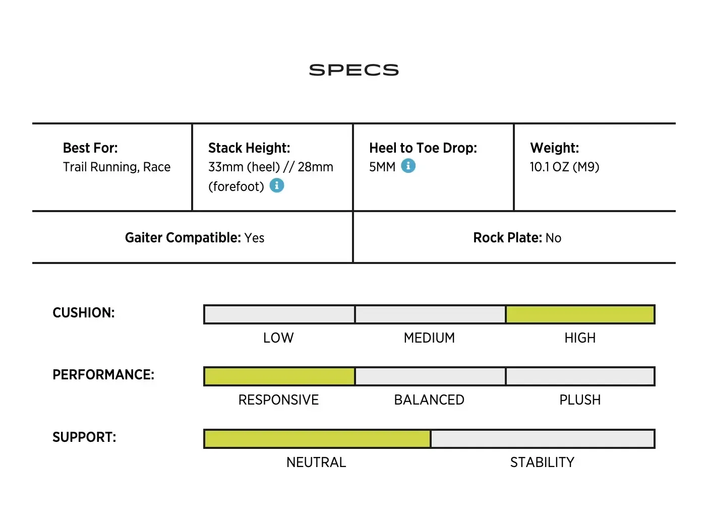Boty MTN Racer 3 mají drop 5 mm, který kombinuje přirozenější došlap s dostatečnou podporou a pohodlím při běhu v rozmanitém terénu. Díky vylepšenému zakřivení špičky navíc usnadňují rychlý přechod do odrazu a zajišťují hladší, efektivnější běh. Pokud hledáš botu s nulovým dropem pro ještě přirozenější pohyb, podívej se například na model Pursuit 2.