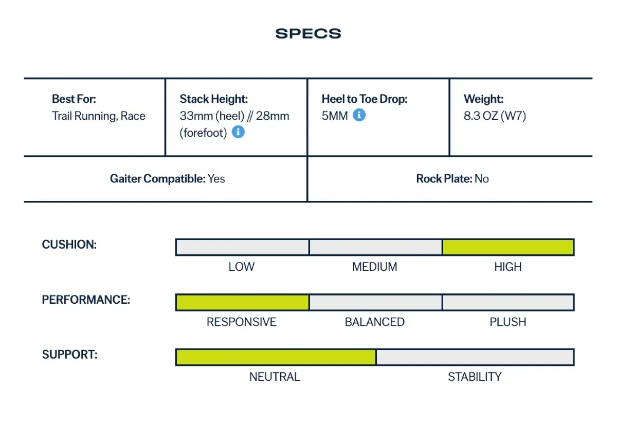 Boty MTN Racer 3 mají drop 5 mm, který kombinuje přirozenější došlap s dostatečnou podporou a pohodlím při běhu v rozmanitém terénu. Díky vylepšenému zakřivení špičky navíc usnadňují rychlý přechod do odrazu a zajišťují hladší, efektivnější běh. Pokud hledáš botu s nulovým dropem pro ještě přirozenější pohyb, podívej se například na model Pursuit 2.