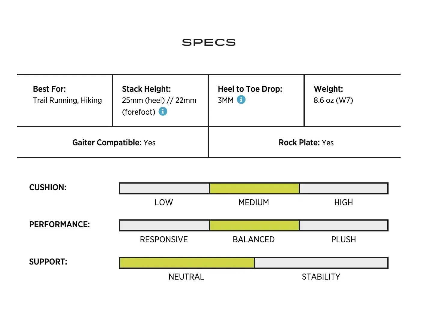 široká prostorná špička pro prsty, odolný tkaný svršek, mezipodešev z paměťové pěny ZipFoam™, ochranný plát Rock Plate, přilnavá podešev s Vibram® Megagrip, stélka OrthoLite®, možnost uchycení návleků