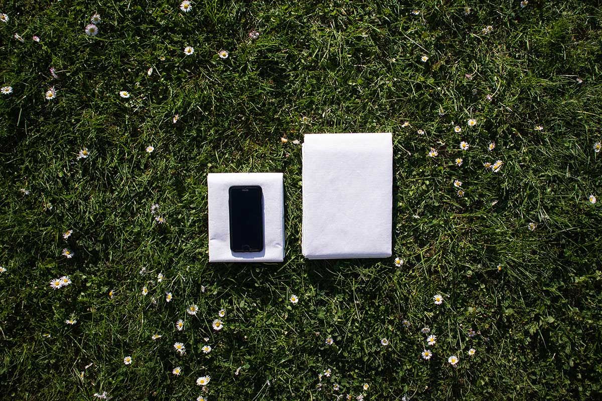 Na fotce můžeš vidět porovnání sbaleného velkého a malého tyveku s velikostí mobilního telefonu.