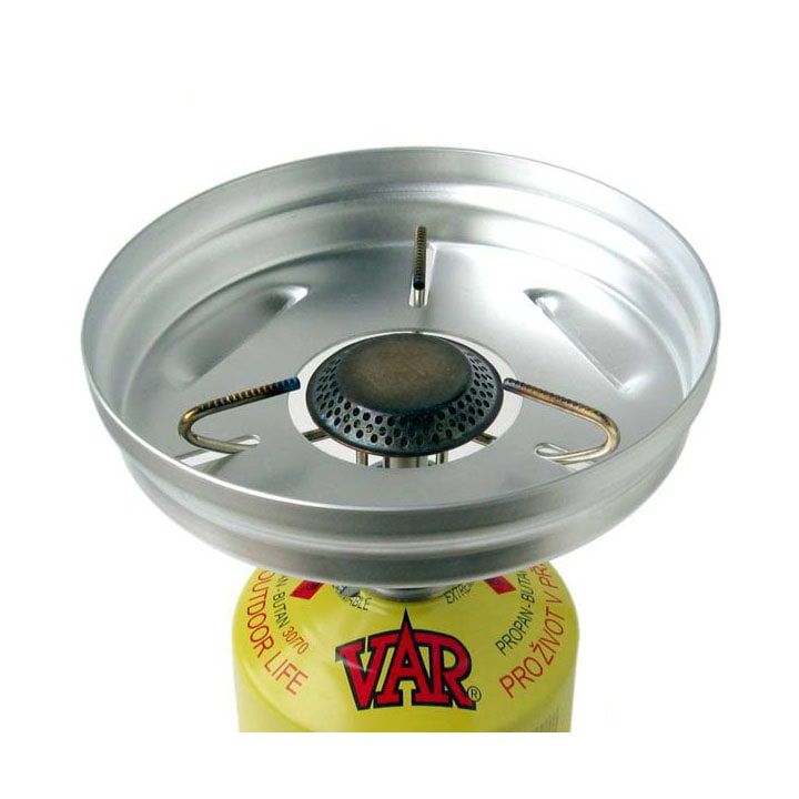Závětří pro plynový vařič VAR 2. Závětří účinně chrání plamen před poryvy větru a velká reflexní plocha odráží veškeré teplo spalných plynů pod varnou nádobu. Po otočení lze použít jako stabilizační podložka pro kartuše s průměrem okolo 110 mm.